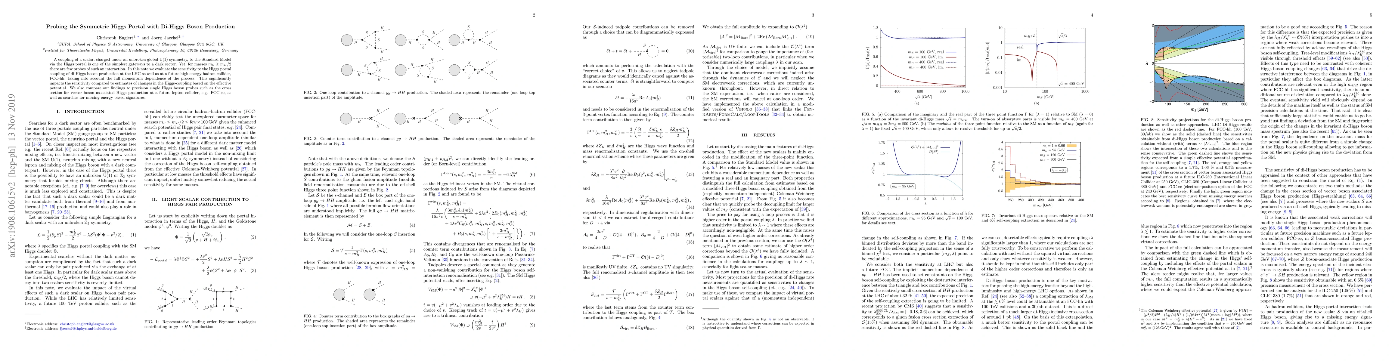 A coupling of a scalar, charged under an unbroken global U(1) symmetry, to the Standard Model via the Higgs portal is one of the simplest gateways to a dark sector. Yet, for masses $m_{S}\geq m_{H}/2$ there are few probes of such an interaction. In this note we evaluate the sensitivity to the Higgs portal coupling of di-Higgs boson production at the LHC as well as at a future high energy hadron collider, FCC-hh, taking into account the full momentum dependence of the process. This significantly impacts the sensitivity compared to estimates of changes in the Higgs-coupling based on the effective potential. We also compare our findings to precision single Higgs boson probes such as the cross section for vector boson associated Higgs production at a future lepton collider, e.g. FCC-ee, as well as searches for missing energy based signatures.