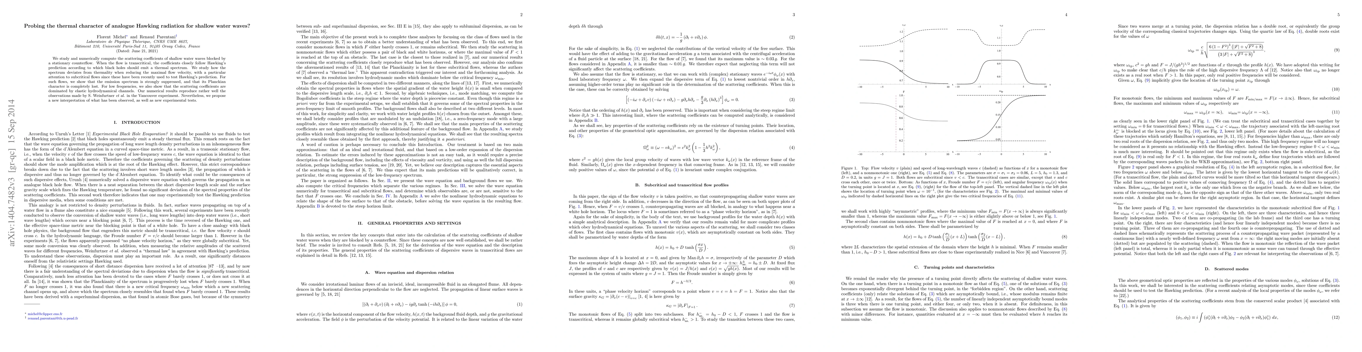 We study and numerically compute the scattering coefficients of shallow water waves blocked by a stationary counterflow. When the flow is transcritical, the coefficients closely follow Hawking's prediction according to which black holes should emit a thermal spectrum. We study how the spectrum deviates from thermality when reducing the maximal flow velocity, with a particular attention to subcritical flows since these have been recently used to test Hawking's prediction. For such flows, we show that the emission spectrum is strongly suppressed, and that its Planckian character is completely lost. For low frequencies, we also show that the scattering coefficients are dominated by elastic hydrodynamical channels. Our numerical results reproduce rather well the observations made by S. Weinfurtner {\it et al.} in the Vancouver experiment. Nevertheless, we propose a new interpretation of what has been observed, as well as new experimental tests.