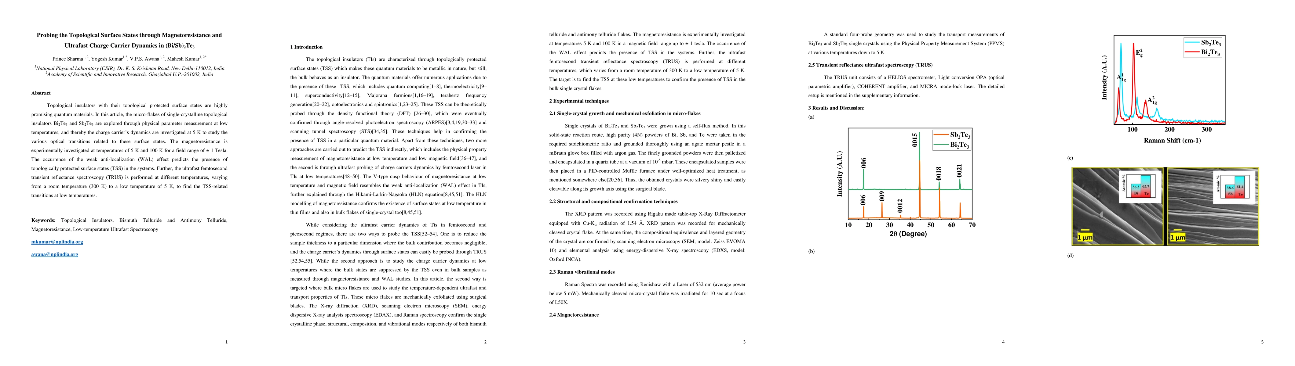 Topological insulators with their topological protected surface states are highly promising quantum materials. In this article the micro-flakes of single-crystalline topological insulators Bi2Te3 and Sb2Te3 are explored through physical parameter measurement at low temperatures and thereby the charge carrier dynamics are investigated at 5K to study the various optical transitions related to these surface states. The magnetoresistance is experimentally investigated at temperatures of 5K and 100K for a field range of 1Tesla. The occurrence of the weak anti-localization effect predicts the presence of topologically protected surface states in the systems. Further, the ultrafast femtosecond transient reflectance spectroscopy is performed at different temperatures, varying from a room temperature (300K) to a low temperature of 5K, to find the TSS related transitions at low temperatures.
