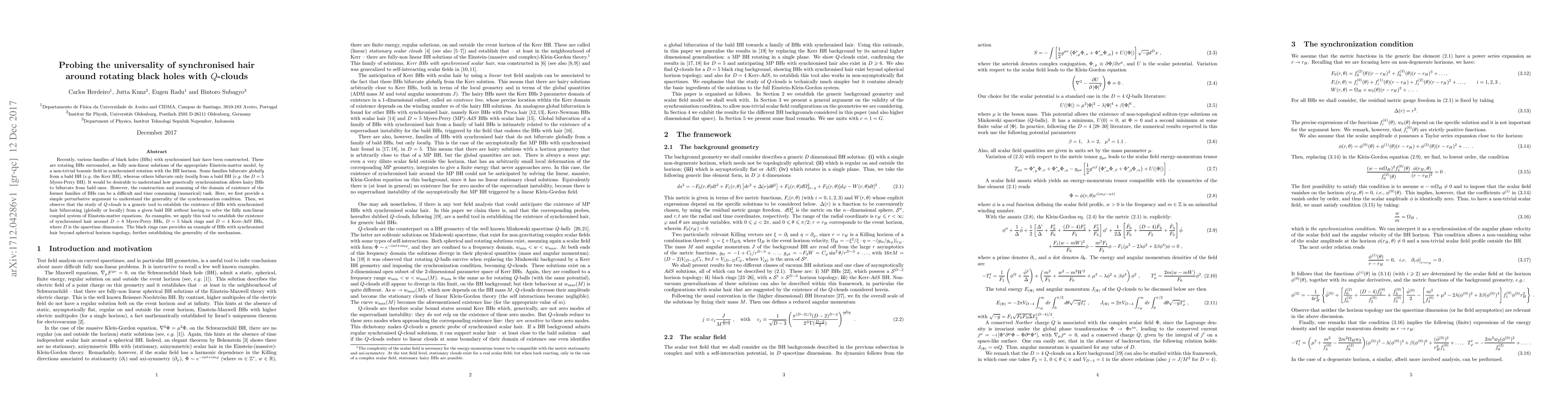 This paper explores the universality of synchronised hair around rotating black holes using Q-clouds as a tool. It provides a perturbative argument for the synchronisation condition and demonstrates that Q-clouds can establish the existence of hairy BHs bifurcating from bald ones without solving the full Einstein-matter equations, applied to various dimensions and types of black holes.