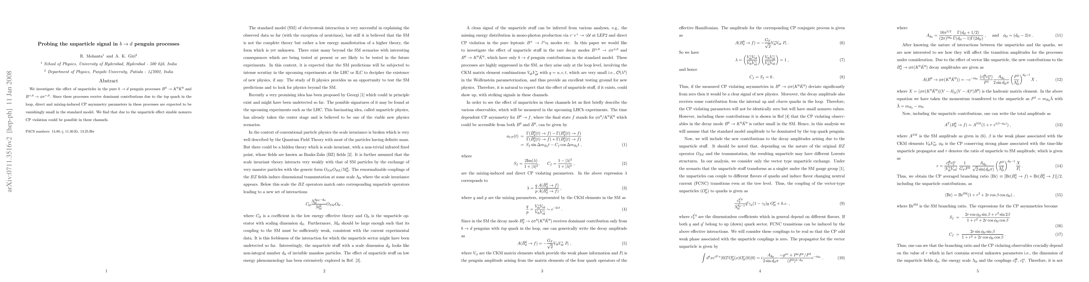 We investigate the effect of unparticles in the pure $ b \to d $ penguin processes $ B^0 \to K^0 \bar K^0$ and $B^{+,0} \to \phi \pi^{+,0} $. Since these processes receive dominant contributions due to the {\it top} quark in the loop, direct and mixing-induced CP asymmetry parameters in these processes are expected to be vanishingly small in the standard model. We find that due to the unparticle effect sizable nonzero CP violation could be possible in these channels.