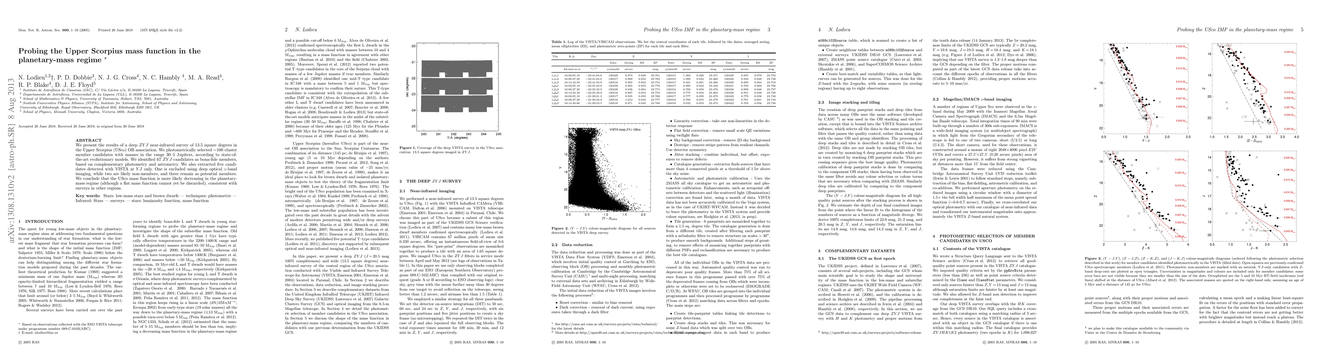 We present the results of a deep ZYJ near-infrared survey of 13.5 square degrees in the Upper Scorpius (USco) OB association. We photometrically selected ~100 cluster member candidates with masses in the range 30-5 Jupiters, according to state-of-the-art evolutionary models. We identified 67 ZYJ candidates as bona-fide members, based on complementary photometry and astrometry. We also extracted five candidates detected with VISTA at YJ-only. One is excluded using deep optical z-band imaging, while two are likely non-members, and three remain as potential members. We conclude that the USco mass function is more likely decreasing in the planetary-mass regime (although a flat mass function cannot yet be discarded), consistent with surveys in other regions.