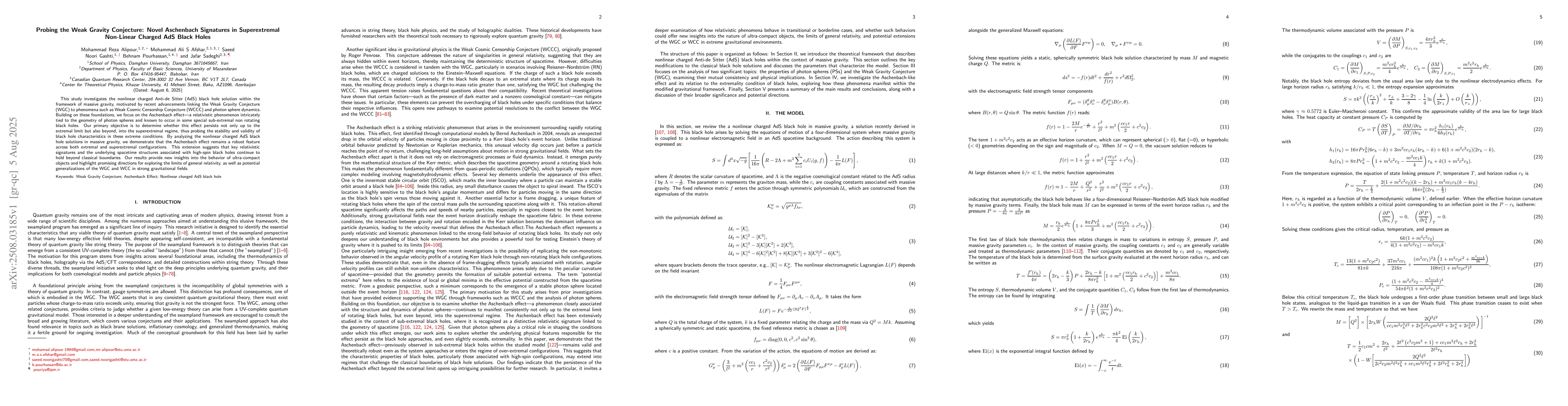 This study investigates the nonlinear charged Anti-de Sitter (AdS) black hole solution within the framework of massive gravity, motivated by recent advancements linking the Weak Gravity Conjecture (WGC) to phenomena such as Weak Cosmic Censorship Conjecture (WCCC) and photon sphere dynamics. Building on these foundations, we focus on the Aschenbach effect-a relativistic phenomenon intricately tied to the geometry of photon spheres and known to occur in some special sub-extremal non rotating black holes. Our primary objective is to determine whether this effect persists not only up to the extremal limit but also beyond, into the superextremal regime, thus probing the stability and validity of black hole characteristics in these extreme conditions. By analyzing the nonlinear charged AdS black hole solutions in massive gravity, we demonstrate that the Aschenbach effect remains a robust feature across both extremal and superextremal configurations. This extension suggests that key relativistic signatures and the underlying spacetime structures associated with high-spin black holes continue to hold beyond classical boundaries. Our results provide new insights into the behavior of ultra-compact objects and highlight promising directions for exploring the limits of general relativity, as well as potential generalizations of the WGC and WCC in strong gravitational fields.