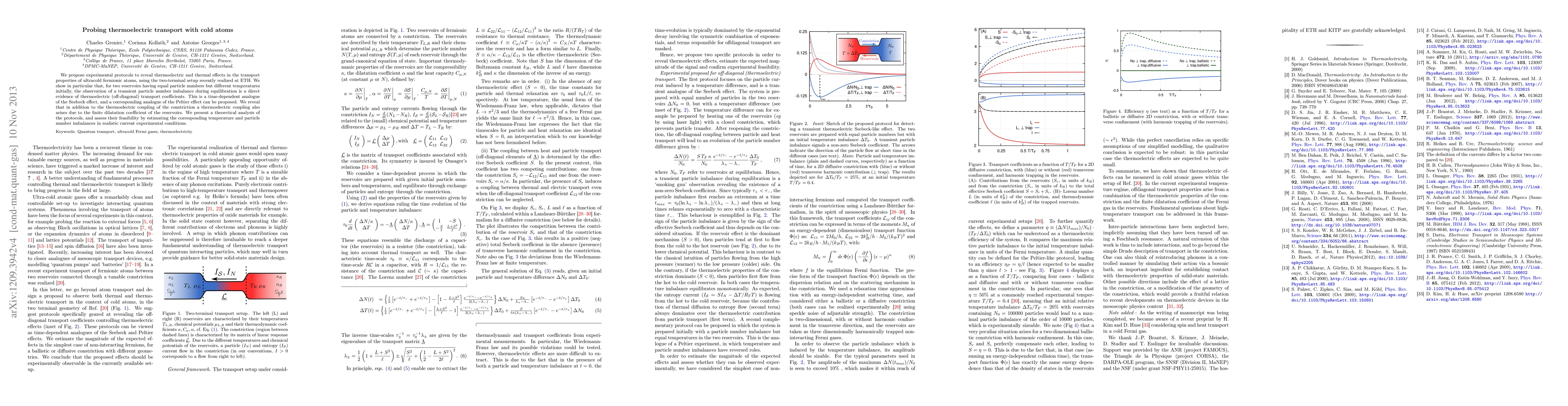 We propose experimental protocols to reveal thermoelectric and thermal effects in the transport properties of ultracold fermionic atoms, using the two-terminal setup recently realized at ETH. We show in particular that, for two reservoirs having equal particle numbers but different temperatures initially, the observation of a transient particle number imbalance during equilibration is a direct evidence of thermoelectric (off-diagonal) transport coefficients. This is a time-dependent analogue of the Seebeck effect, and a corresponding analogue of the Peltier effect can be proposed. We reveal that in addition to the thermoelectric coupling of the constriction a thermoelectric coupling also arises due to the finite dilatation coefficient of the reservoirs. We present a theoretical analysis of the protocols, and assess their feasibility by estimating the corresponding temperature and particle number imbalances in realistic current experimental conditions.