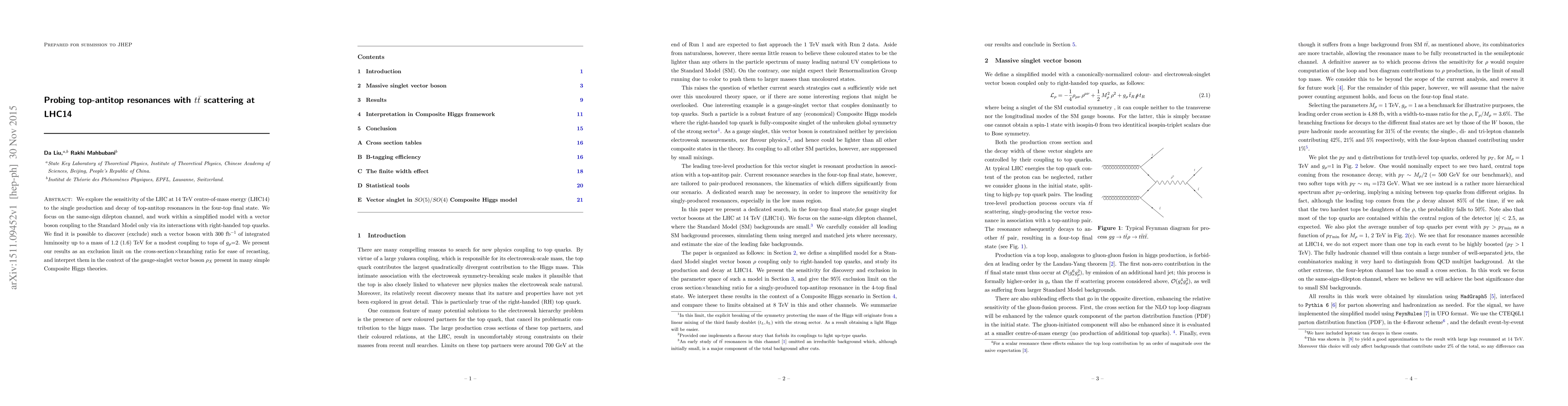 We explore the sensitivity of the LHC at 14 TeV centre-of-mass energy (LHC14) to the single production and decay of top-antitop resonances in the four-top final state. We focus on the same-sign dilepton channel, and work within a simplified model with a vector boson coupling to the Standard Model only via its interactions with right-handed top quarks. We find it is possible to discover (exclude) such a vector boson with 300 fb$^{-1}$ of integrated luminosity up to a mass of 1.2 (1.6) TeV for a modest coupling to tops of $g_\rho$=2. We present our results as an exclusion limit on the cross-section$\times$branching ratio for ease of recasting, and interpret them in the context of the gauge-singlet vector boson $\rho_X$ present in many simple Composite Higgs theories.