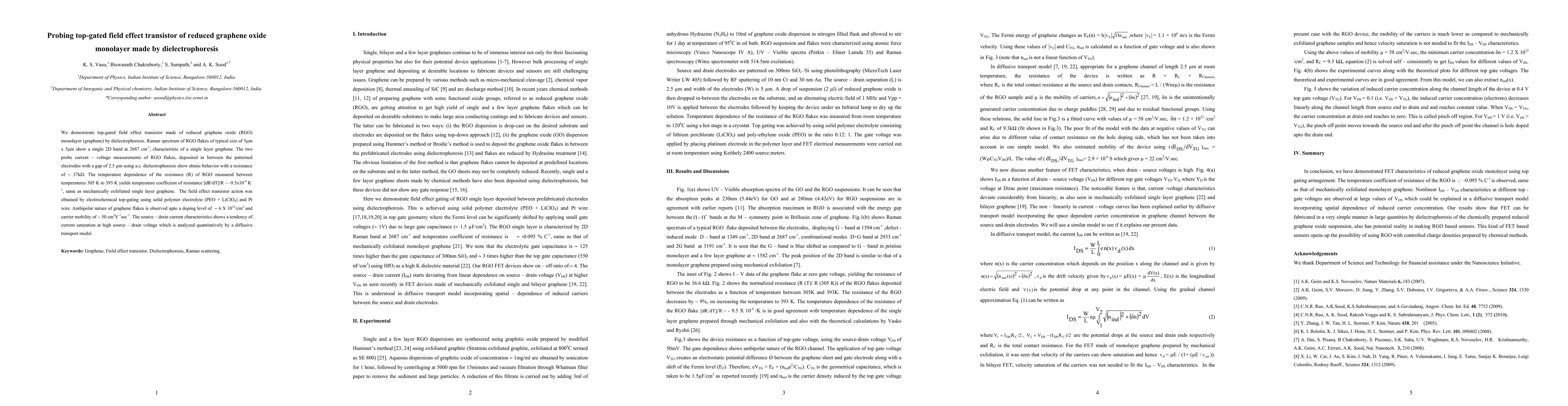 This study presents a top-gated field effect transistor utilizing a reduced graphene oxide monolayer fabricated via dielectrophoresis, demonstrating ohmic behavior and a temperature-dependent resistance similar to mechanically exfoliated graphene, with ambipolar transport and carrier mobility of approximately 50 cm²V⁻¹s⁻¹.