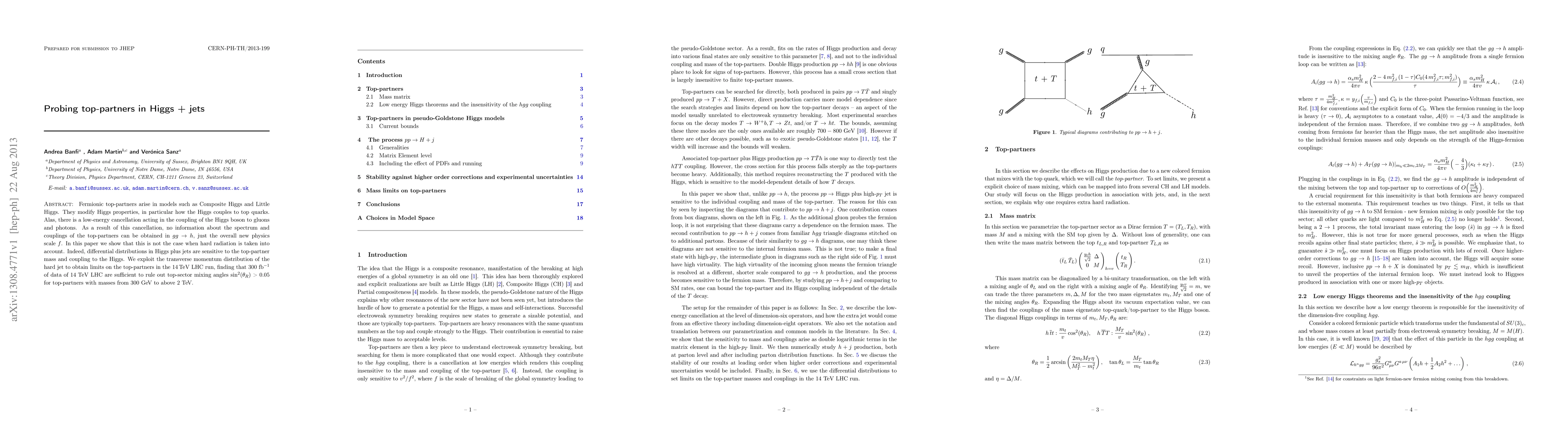 This paper investigates the impact of fermionic top-partners in Higgs + jets events, demonstrating that differential distributions in these events are sensitive to top-partner masses and couplings. Using 300 ifb of 14 TeV LHC data, the study finds that top-sector mixing angles $\sin^2 (\theta_R)$ can be constrained to < 0.05 for top-partner masses ranging from 300 GeV to above 2 TeV.