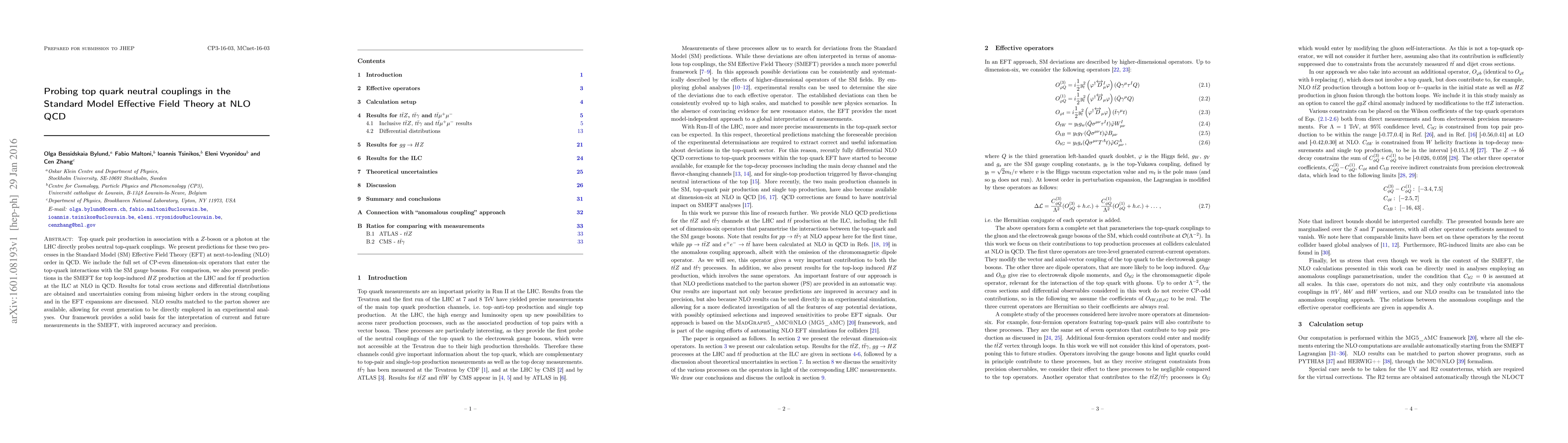 This paper investigates top quark neutral couplings in the Standard Model Effective Field Theory (SMEFT) at next-to-leading order (NLO) in QCD, focusing on top quark pair production in association with a $Z$-boson or photon at the LHC. It provides predictions for these processes and compares them with top loop-induced $HZ$ production and $t\bar{t}$ production at the ILC, offering a framework for interpreting current and future SMEFT measurements with enhanced accuracy.