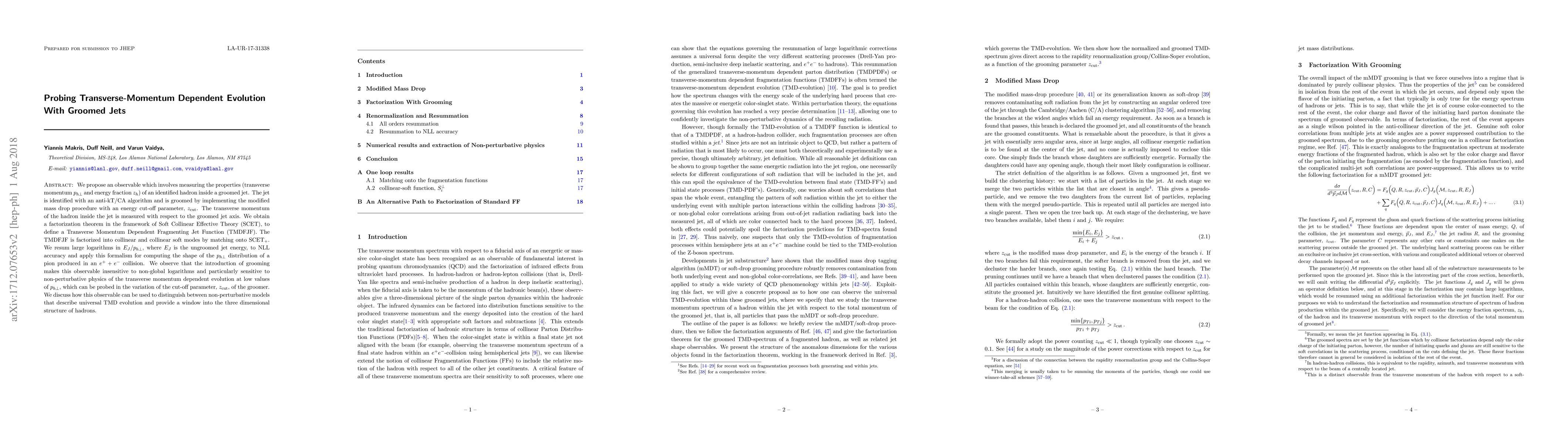 We propose an observable which involves measuring the properties (transverse momentum $p_{h\perp}$ and energy fraction $z_h$) of an identified hadron inside a groomed jet. The jet is identified with an anti-kT/CA algorithm and is groomed by implementing the modified mass drop procedure with an energy cut-off parameter $z_{cut}$. The transverse momentum of the hadron inside the jet is measured with respect to the groomed jet axis. We obtain a factorization theorem in the framework of Soft Collinear Effective Theory (SCET), to define a Transverse Momentum Dependent Fragmenting Jet Function (TMDFJF). The TMDFJF is factorized into collinear and collinear soft modes by matching onto SCET$_+$. We resum large logarithms in $E_J/p_{h\perp}$, where $E_J$ is the ungroomed jet energy, to NLL accuracy and apply this formalism for computing the shape of the $p_{h\perp}$ distribution of a pion produced in an $e^+ +e^-$ collision. We observe that the introduction of grooming makes this observable insensitive to non-global logarithms and particularly sensitive to non-perturbative physics of the transverse momentum dependent evolution at low values of $p_{h\perp}$, which can be probed in the variation of the cut-off parameter $z_{cut}$ of the groomer. We discuss how this observable can be used to distinguish between non-perturbative models that describe universal TMD evolution and provide a window into the three dimensional structure of hadrons.