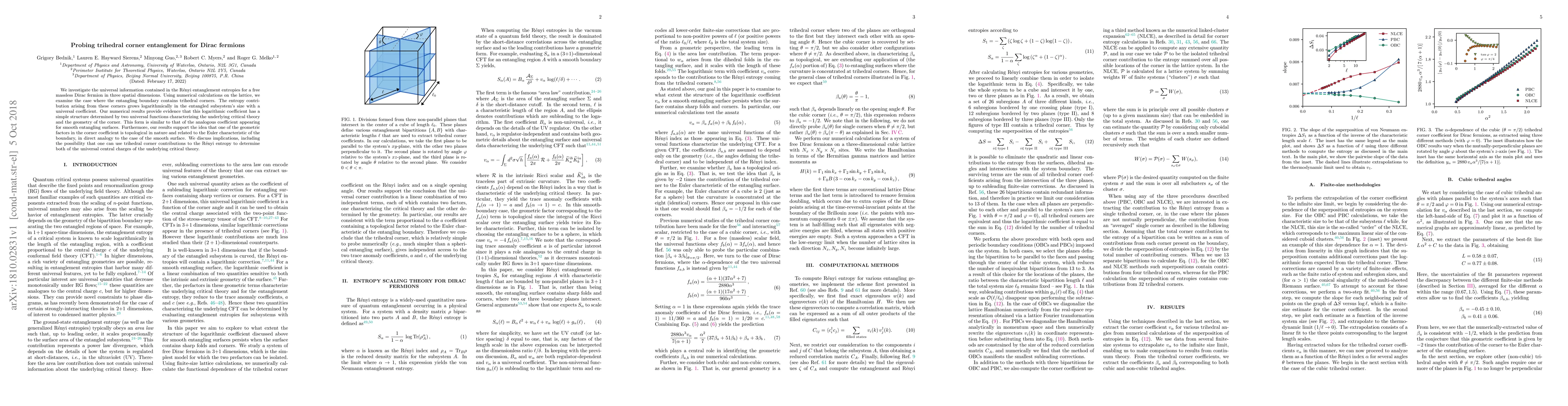 We investigate the universal information contained in the Renyi entanglement entropies for a free massless Dirac fermion in three spatial dimensions. Using numerical calculations on the lattice, we examine the case where the entangling boundary contains trihedral corners. The entropy contribution arising from these corners grows logarithmically in the entangled subsystem's size with a universal coefficient. Our numerical results provide evidence that this logarithmic coefficient has a simple structure determined by two universal functions characterizing the underlying critical theory and the geometry of the corner. This form is similar to that of the analogous coefficient appearing for smooth entangling surfaces. Furthermore, our results support the idea that one of the geometric factors in the corner coefficient is topological in nature and related to the Euler characteristic of the boundary, in direct analogy to the case of the smooth surface. We discuss implications, including the possibility that one can use trihedral corner contributions to the Renyi entropy to determine both of the universal central charges of the underlying critical theory.