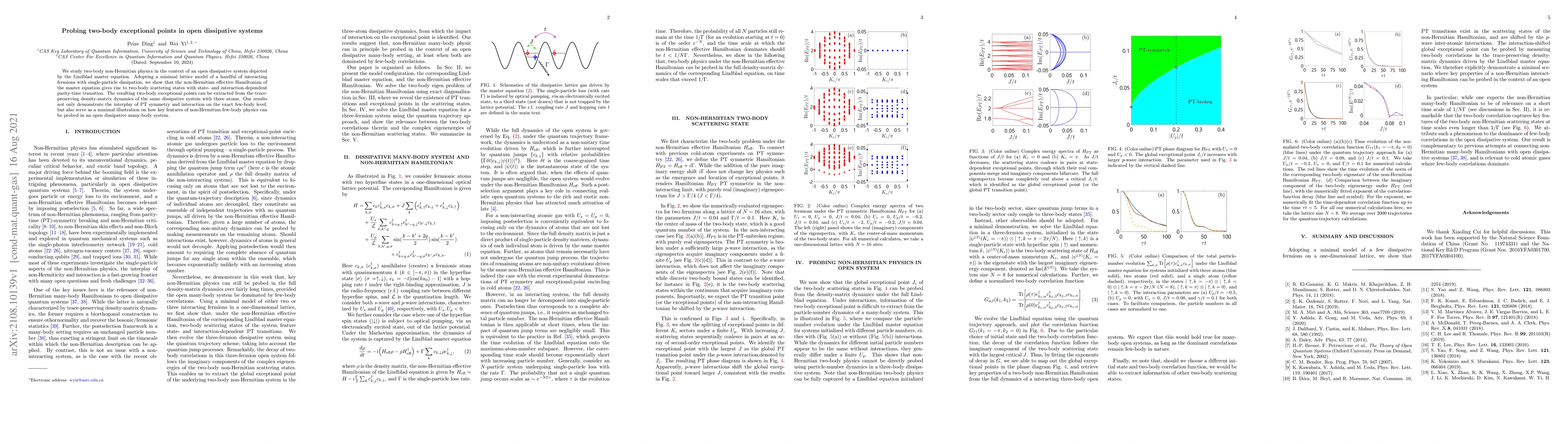 This paper investigates two-body exceptional points in open dissipative systems using a minimal lattice model of interacting fermions. It demonstrates the emergence of parity-time transition and two-body scattering states, highlighting the interplay between PT symmetry and interaction in non-Hermitian few-body physics.