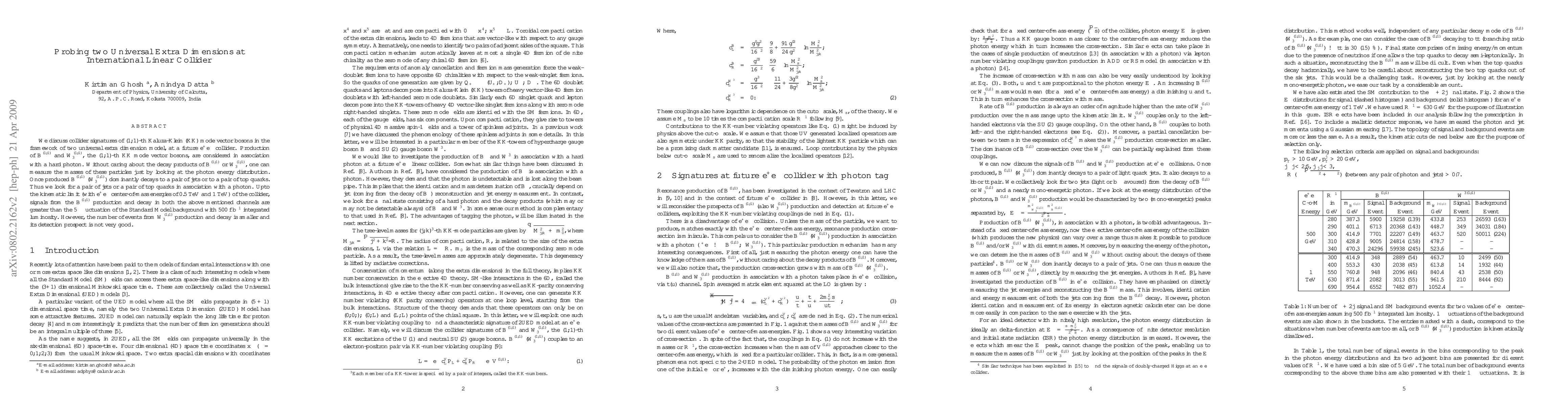 We discuss collider signatures of (1,1)-th Kaluza-Klein (KK) mode vector bosons in the framework of two universal extra dimension model, at a future electron-positron collider. Production of the (1,1)-th KK mode of electro-weak vector bosons (B(1,1), W3(1,1)), are considered in association with a hard photon. Without caring about the decay products of those vector bosons, one can measure the masses of these particles just by looking at the photon energy distribution. Once produced these particles dominantly decay to a pair of jets or to a pair of top quarks. Thus we look for a pair of jets or a pair of top quarks in association with a photon. Upto the kinematic limit of the collider, signals from the B(1,1) production and decay in both the above mentioned channels are greater than the $5\sigma$ fluctuation of the Standard Model background. However, the number of events from W3(1,1) production and decay is smaller and its detection prospect is not very good.