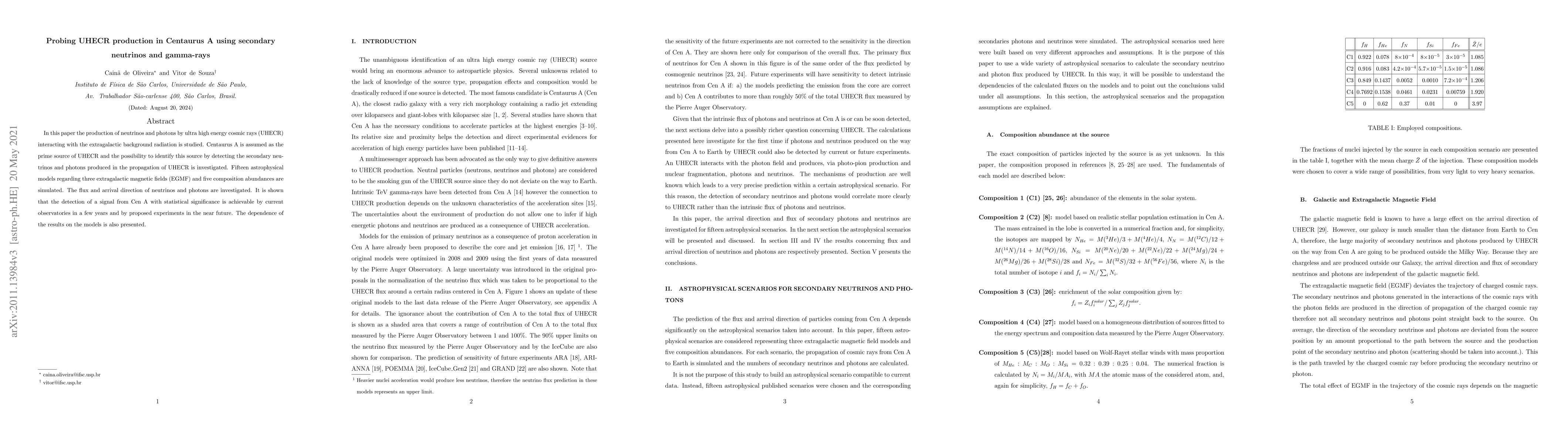 This paper investigates Centaurus A as a potential source of ultra high energy cosmic rays (UHECR) by simulating the production of secondary neutrinos and gamma-rays. It demonstrates that current and upcoming observatories could detect a significant signal from Centaurus A within a few years, contingent on the chosen astrophysical models.