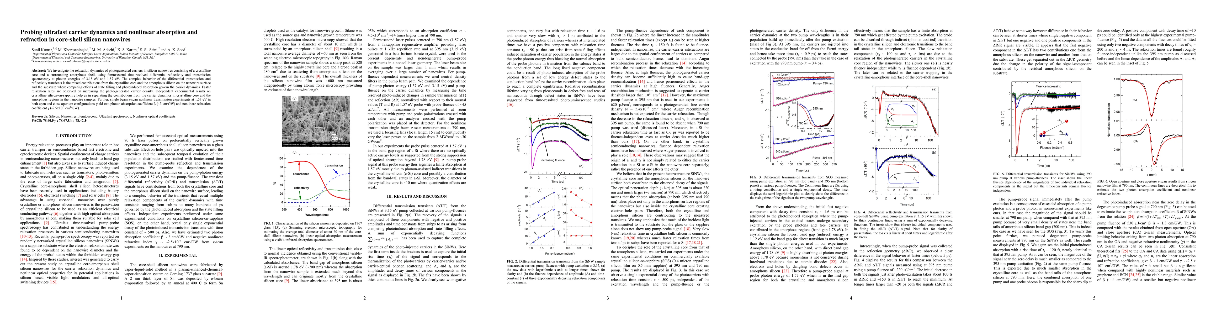 This paper explores the ultrafast carrier dynamics and nonlinear optical properties in core-shell silicon nanowires using femtosecond spectroscopy. It reveals faster relaxation rates with higher carrier densities and identifies two-photon absorption and nonlinear refraction coefficients through z-scan experiments.