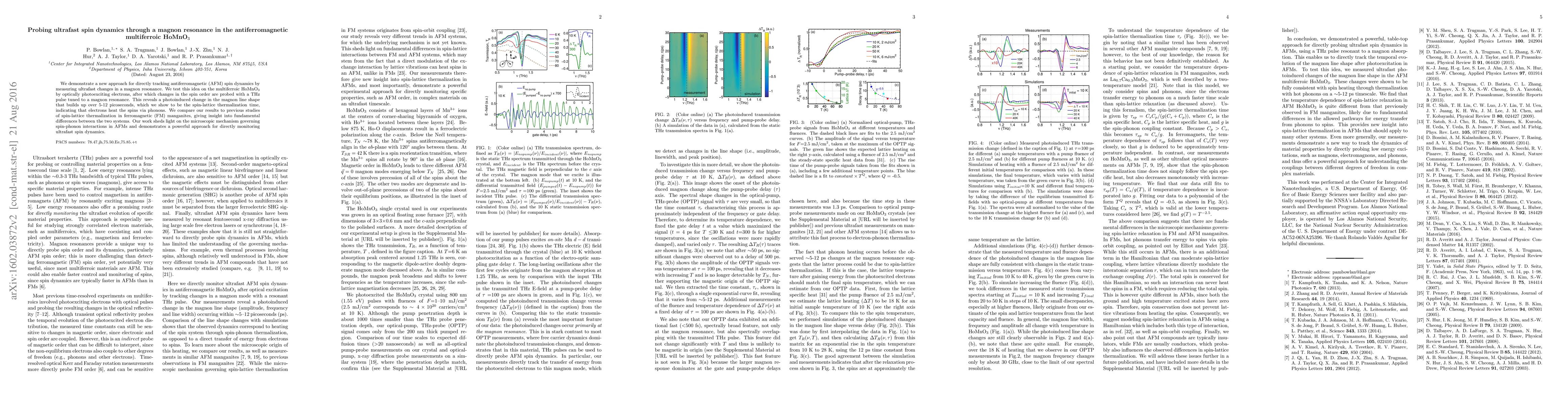 We demonstrate a new approach for directly measuring the ultrafast energy transfer between elec- trons and magnons, enabling us to track spin dynamics in an antiferromagnet (AFM). In multiferroic HoMnO3, optical photoexcitation creates hot electrons, after which changes in the spin order are probed with a THz pulse tuned to a magnon resonance. This reveals a photoinduced transparency, which builds up over several picoseconds as the spins heat up due to energy transfer from hot elec- trons via phonons. This spin-lattice thermalization time is ?10 times faster than that of typical ferromagnetic (FM) manganites. We qualitatively explain the fundamental differences in spin-lattice thermalization between FM and AFM systems and apply a Boltzmann equation model for treating AFMs. Our work gives new insight into spin-lattice thermalization in AFMs and demonstrates a new approach for directly monitoring the ultrafast dynamics of spin order in these systems.