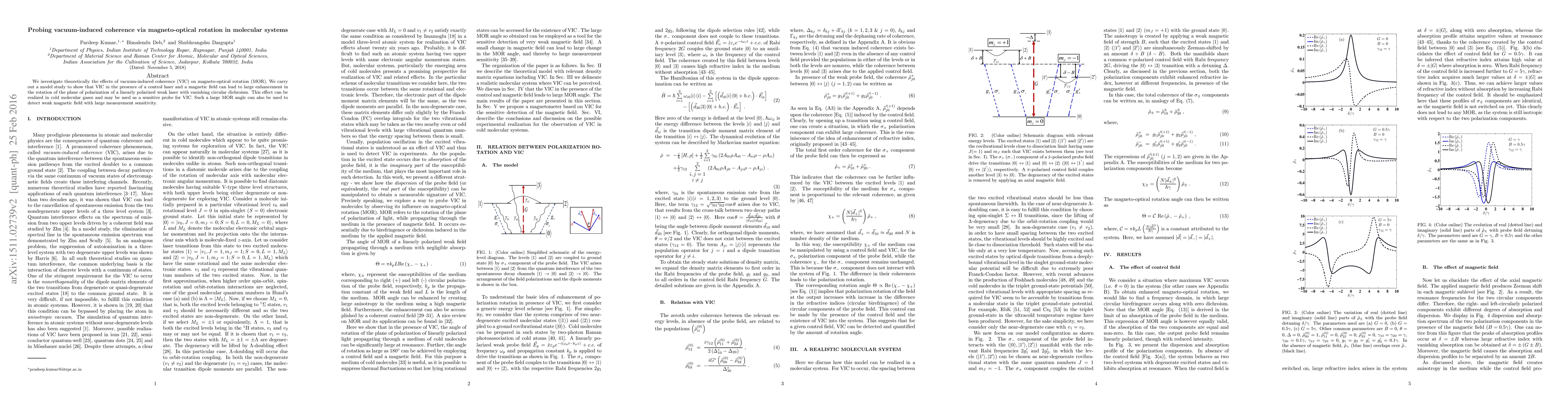 We investigate theoretically the effects of vacuum-induced coherence (VIC) on magneto-optical rotation (MOR). We carry out a model study to show that VIC in the presence of a control laser and a magnetic field can lead to large enhancement in the rotation of the plane of polarization of a linearly polarized weak laser with vanishing circular dichroism. This effect can be realized in cold molecular gases and may be used as a sensitive probe for VIC. Such a large MOR angle can also be used to detect weak magnetic field with large measurement sensitivity.