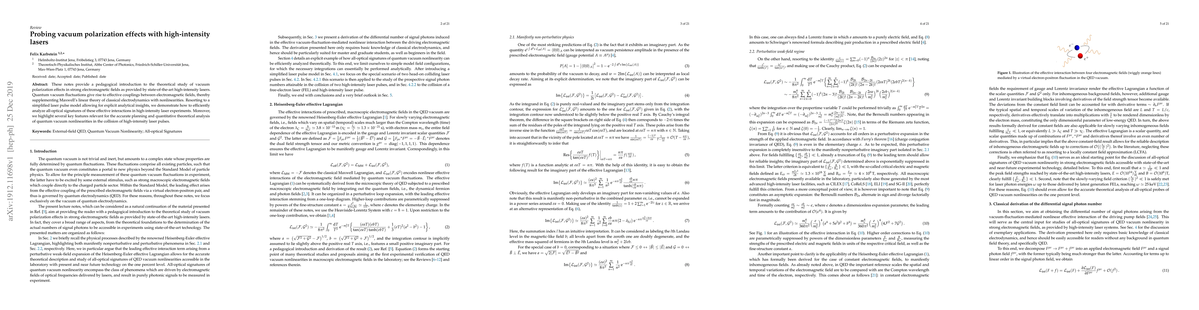 These notes provide a pedagogical introduction to the theoretical study of vacuum polarization effects in strong electromagnetic fields as provided by state-of-the-art high-intensity lasers. Quantum vacuum fluctuations give rise to effective couplings between electromagnetic fields, thereby supplementing Maxwell's linear theory of classical electrodynamics with nonlinearities. Resorting to a simplified laser pulse model allowing for explicit analytical insights, we demonstrate how to efficiently analyze all-optical signatures of these effective interactions in high-intensity laser experiments. Moreover, we highlight several key features relevant for the accurate planning and quantitative theoretical analysis of quantum vacuum nonlinearities in the collision of high-intensity laser pulses.