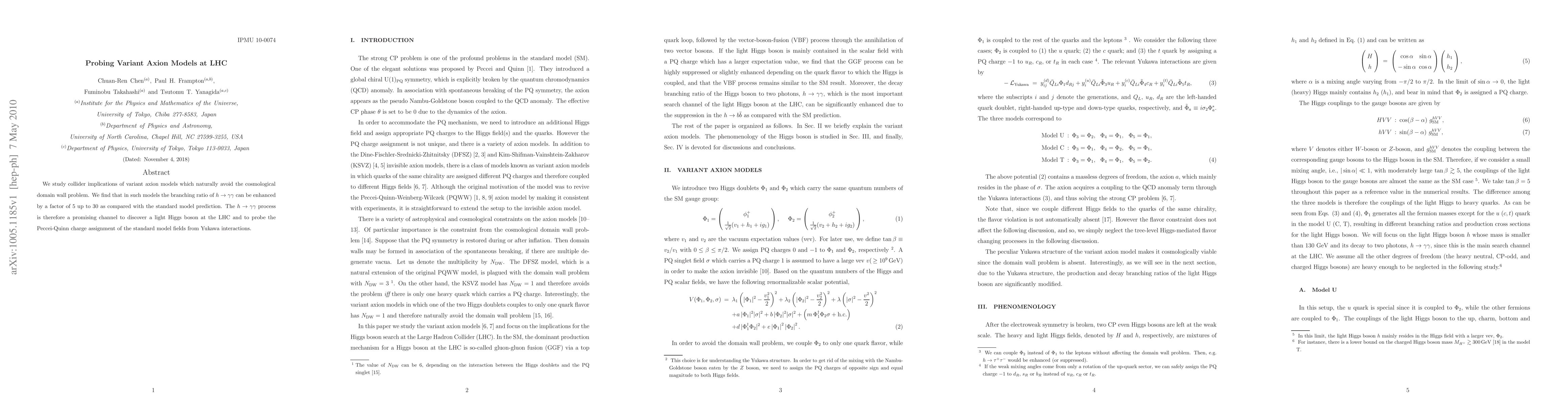 A recent study found that variant axion models could produce a 5- to 30-fold increase in the branching ratio of the Higgs boson decaying into two photons, making this process a promising channel for discovering a light Higgs boson at the LHC.