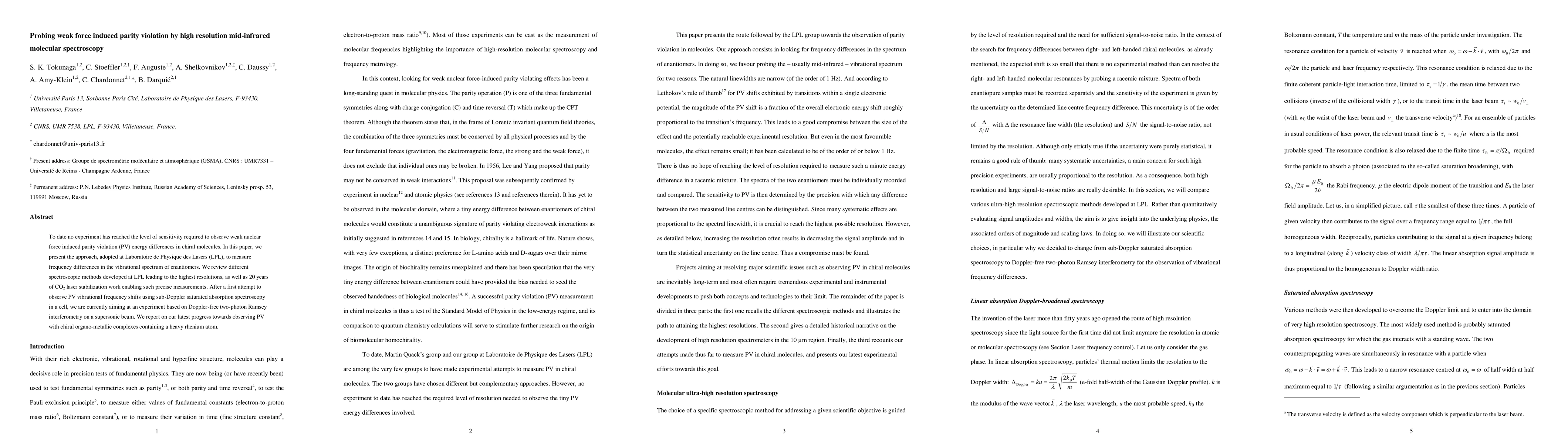 This paper explores high-resolution mid-infrared molecular spectroscopy to detect weak nuclear force induced parity violation in chiral molecules, detailing the advanced techniques and laser stabilization methods developed at LPL, and reporting progress towards observing these effects using Doppler-free two-photon Ramsey interferometry.