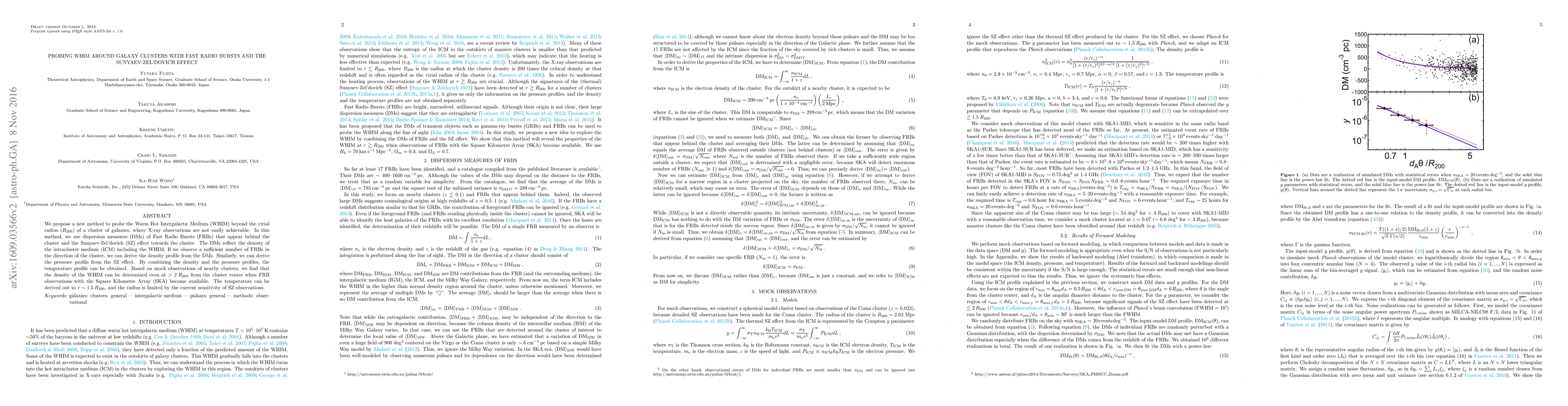 This paper proposes a novel method to investigate the Warm Hot Intergalactic Medium (WHIM) beyond the virial radius of galaxy clusters using Fast Radio Bursts (FRBs) and the Sunyaev-Zel'dovich (SZ) effect. The method combines FRB dispersion measures and SZ effect data to derive density, pressure, and temperature profiles of the intracluster medium, enabling the study of WHIM beyond typical X-ray observation limits.