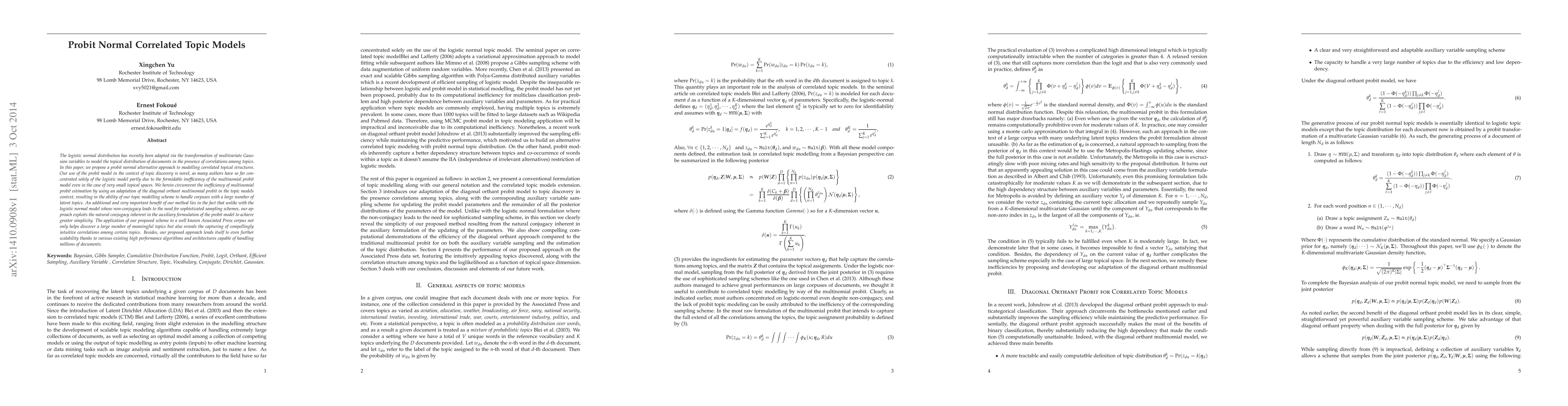 This paper proposes a probit normal correlated topic model to handle large corpora with many latent topics, circumventing the inefficiencies of the multinomial probit model through a diagonal orthant adaptation. Unlike logistic normal models, the probit model's conjugacy simplifies the estimation process, and it successfully discovers meaningful topics and correlations in a test corpus.