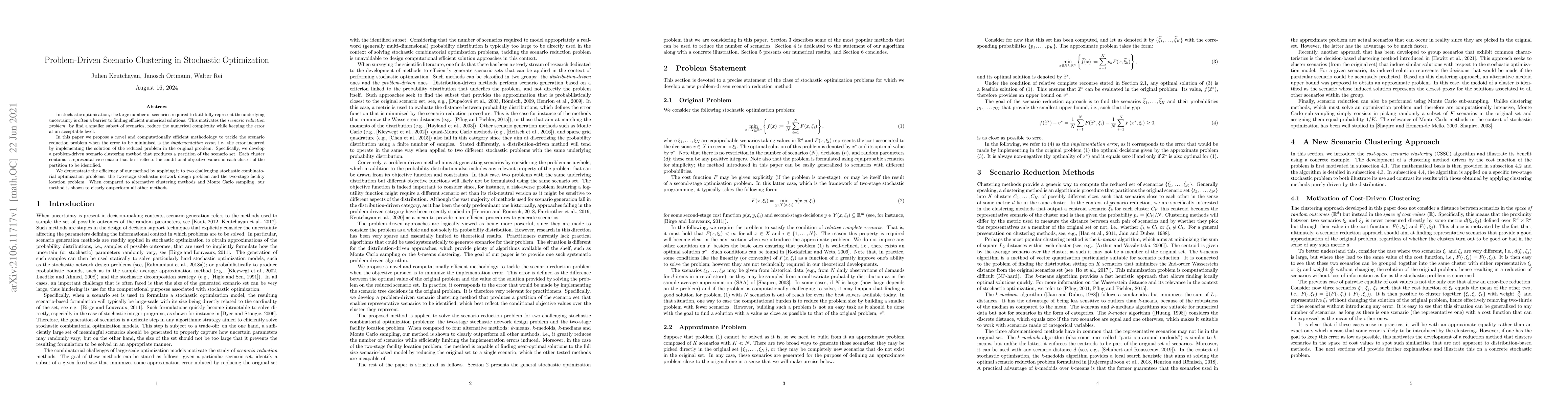 This paper proposes a novel, computationally efficient scenario clustering method for reducing the complexity of stochastic optimization problems while maintaining acceptable implementation error. The method outperforms alternative clustering and sampling techniques in two challenging stochastic combinatorial optimization problems.