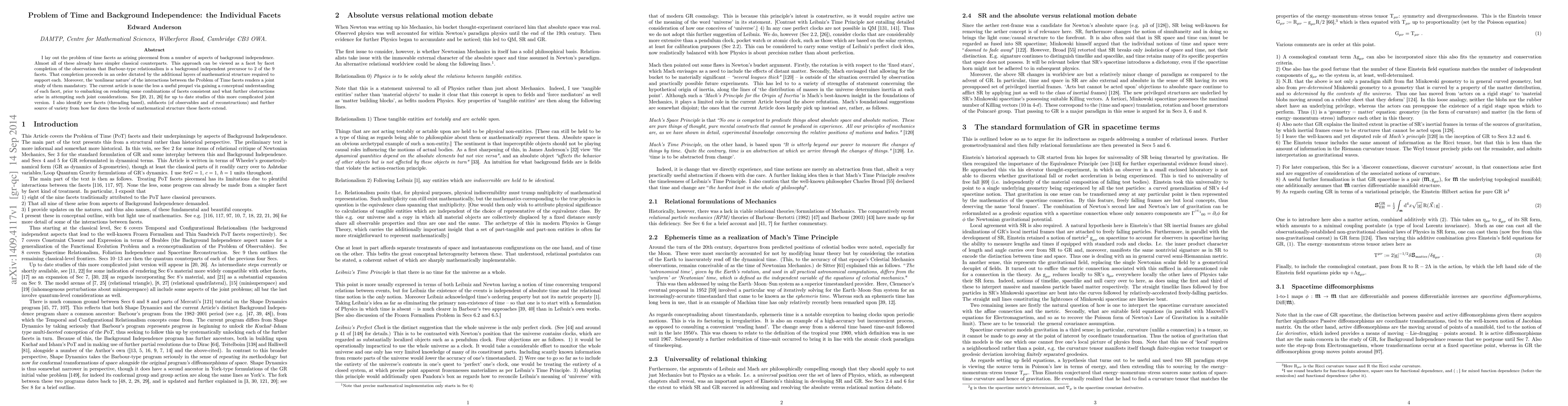 I lay out the problem of time facets as arising piecemeal from a number of aspects of background independence. Almost all of these already have simpler classical counterparts. This approach can be viewed as a facet by facet completion of the observation that Barbour-type relationalism is a background independent precursor to 2 of the 9 facets. That completion proceeds in an order dictated by the additional layers of mathematical structure required to support each. Moreover, the `nonlinear nature' of the interactions between the Problem of Time facets renders a joint study of them mandatory. The current article is none the less a useful prequel via gaining a conceptual understanding of each facet, prior to embarking on rendering some combinations of facets consistent and what further obstructions arise in attempting such joint considerations. See [20, 21, 26] for up to date studies of this more complicated joint version. I also identify new facets (threading based), subfacets (of observables and of reconstructions) and further source of variety from how far down the levels of mathematical structure these facets extend.
