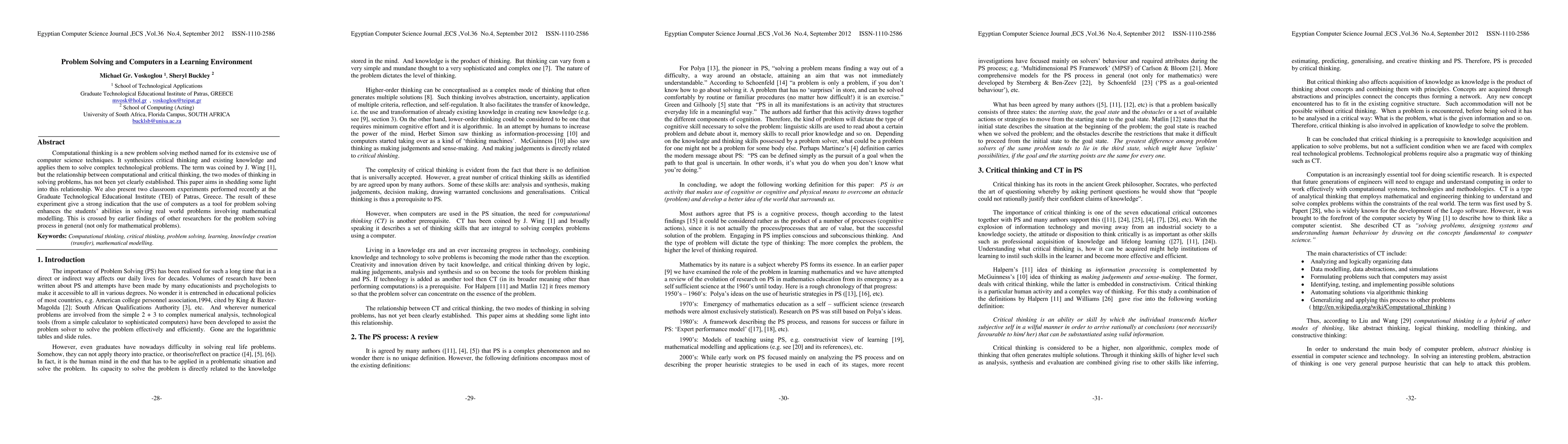 This paper explores the relationship between computational thinking and critical thinking in problem solving, highlighting their integration in educational settings. Results from classroom experiments in Greece suggest that using computers enhances students' problem-solving skills in real-world, mathematical modeling scenarios.