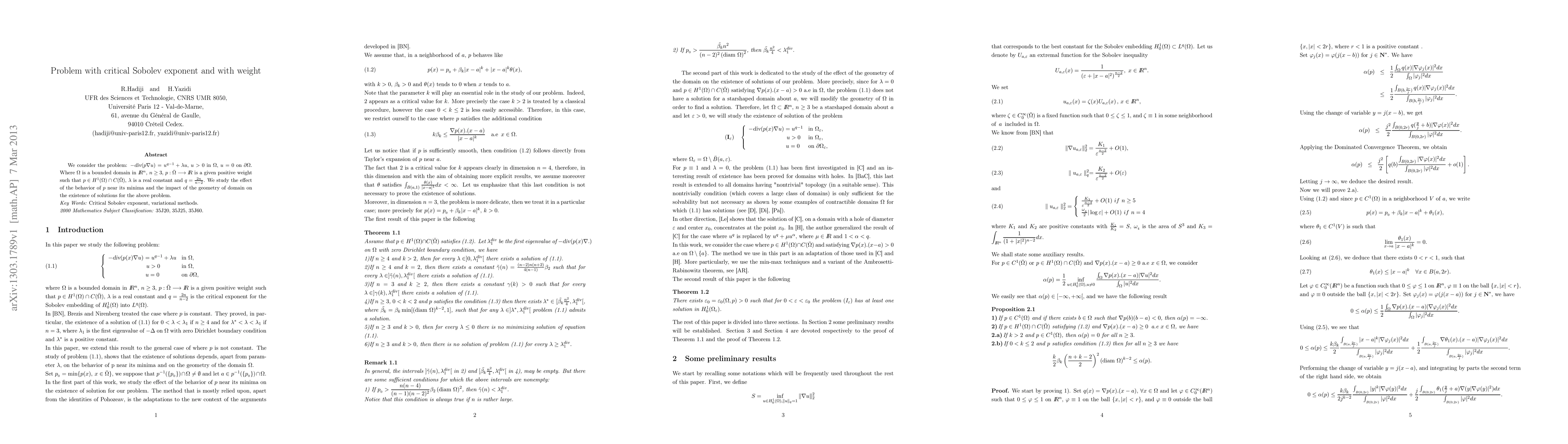 This paper investigates existence results for a problem with critical Sobolev exponent and positive weight, shedding light on the challenges of such mathematical structures.