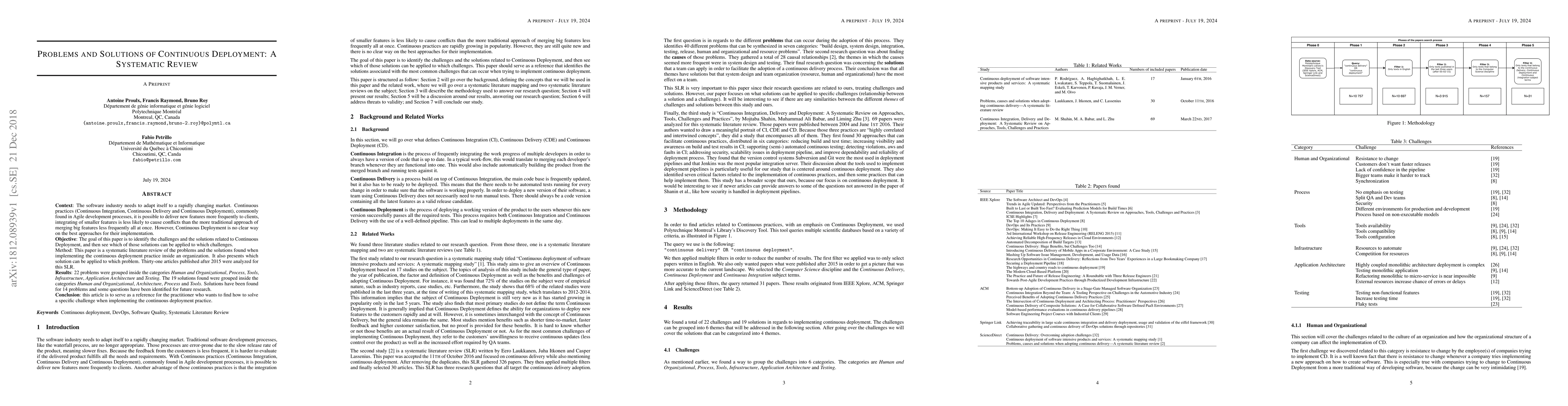 This paper systematically reviews challenges and solutions in continuous deployment practices, identifying 22 problems categorized into Human and Organizational, Process, Tools, Infrastructure, Application Architecture, and Testing. It finds 19 solutions grouped into Human and Organizational, Architecture, Process, and Tools, providing a reference for practitioners to address specific implementation challenges.