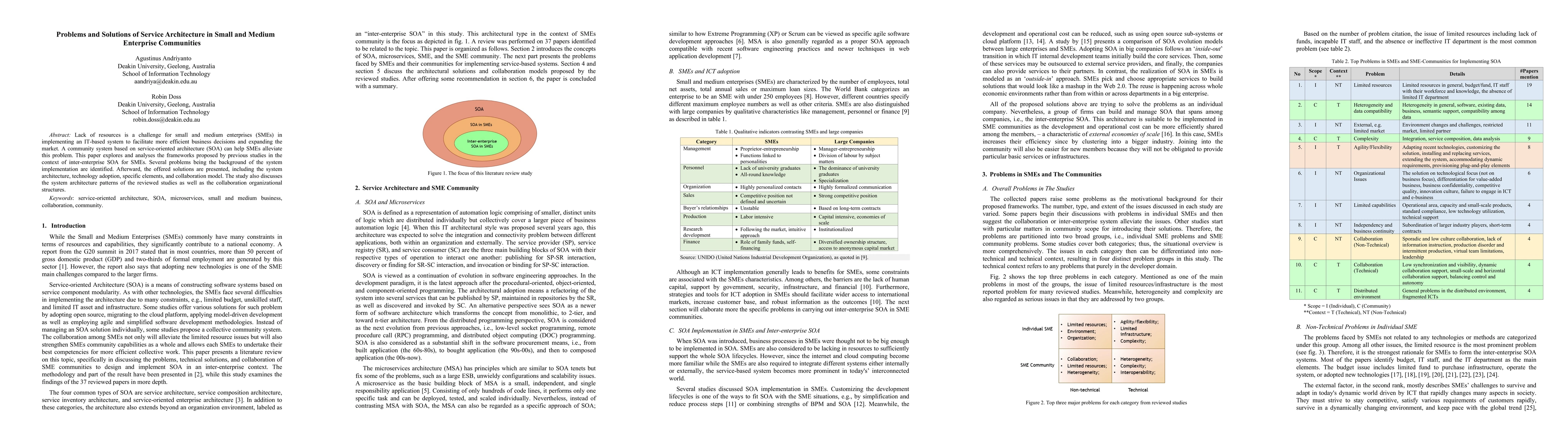 Lack of resources is a challenge for small and medium enterprises (SMEs) in implementing an IT-based system to facilitate more efficient business decisions and expanding the market. A community system based on service-oriented architecture (SOA) can help SMEs alleviate this problem. This paper explores and analyses the frameworks proposed by previous studies in the context of inter-enterprise SOA for SMEs. Several problems being the background of the system implementation are identified. Afterward, the offered solutions are presented, including the system architecture, technology adoption, specific elements, and collaboration model. The study also discusses the system architecture patterns of the reviewed studies as well as the collaboration organizational structures.