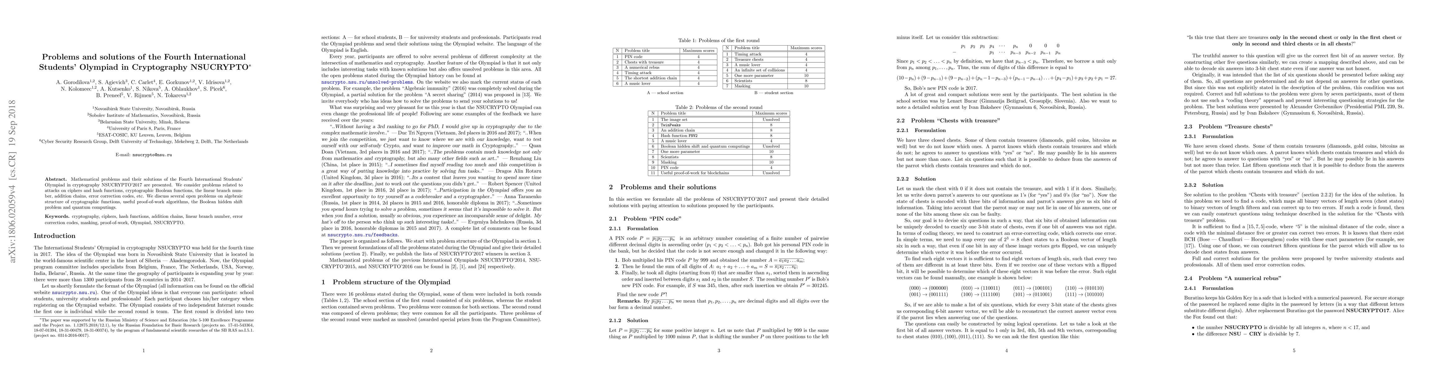 This paper presents solutions to mathematical problems from the Fourth International Students' Olympiad in Cryptography (NSUCRYPTO'2017), focusing on attacks on ciphers and hash functions, cryptographic Boolean functions, and topics like the linear branch number and error correction codes. It also explores open problems in algebraic structures of cryptographic functions and quantum computing.