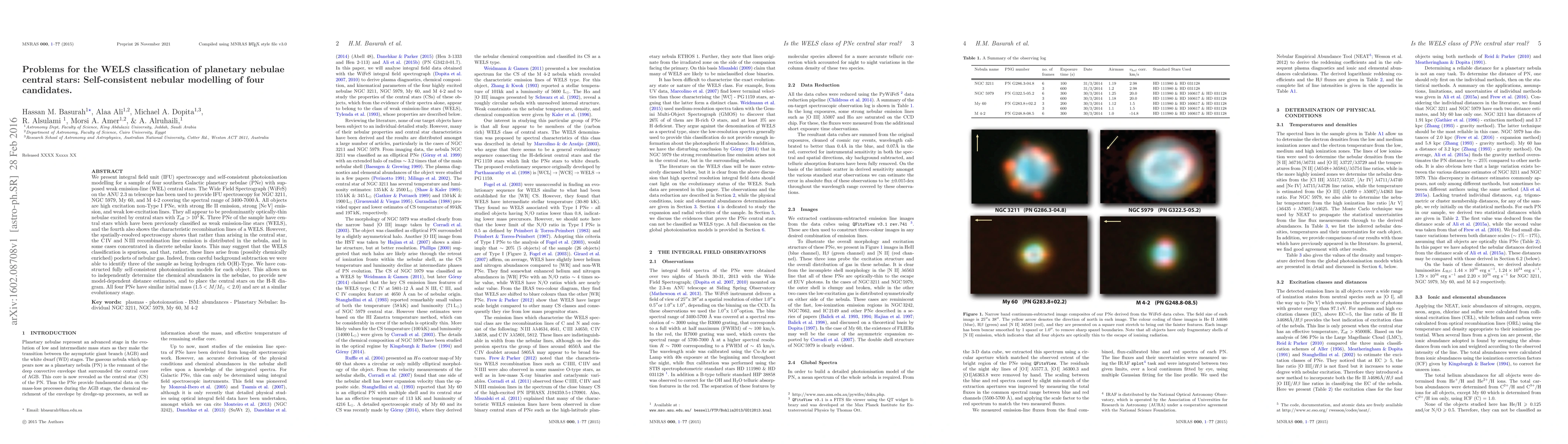 We present integral field unit (IFU) spectroscopy and self-consistent photoionisation modelling for a sample of four southern Galactic planetary nebulae (PNe) with supposed weak emission-line (WEL) central stars. The Wide Field Spectrograph (WiFeS) on the ANU 2.3 m telescope has been used to provide IFU spectroscopy for NGC 3211, NGC 5979, My 60, and M 4-2 covering the spectral range of 3400-7000{\AA}. All objects are high excitation non-Type I PNe, with strong He II emission, strong [Ne V] emission, and weak low-excitation lines. They all appear to be predominantly optically-thin nebulae excited by central stars with $T_{\rm eff} > 10^5$K. Three PNe of the sample have central stars which have been previously classified as weak emission-line stars (WELS), and the fourth also shows the characteristic recombination lines of a WELS. However, the spatially-resolved spectroscopy shows that rather than arising in the central star, the C IV and N III recombination line emission is distributed in the nebula, and in some cases concentrated in discrete nebular knots. This may suggest that the WELS classification is spurious, and that, rather, these lines arise from (possibly chemically enriched) pockets of nebular gas. Indeed, from careful background subtraction we were able to identify three of the sample as being hydrogen rich O(H)-Type. We have constructed fully self-consistent photoionization models for each object. This allows us to independently determine the chemical abundances in the nebulae, to provide new model-dependent distance estimates, and to place the central stars on the H-R diagram. All four PNe have similar initial mass ($1.5 < M/M_{\odot} <2.0$) and are at a similar evolutionary stage.