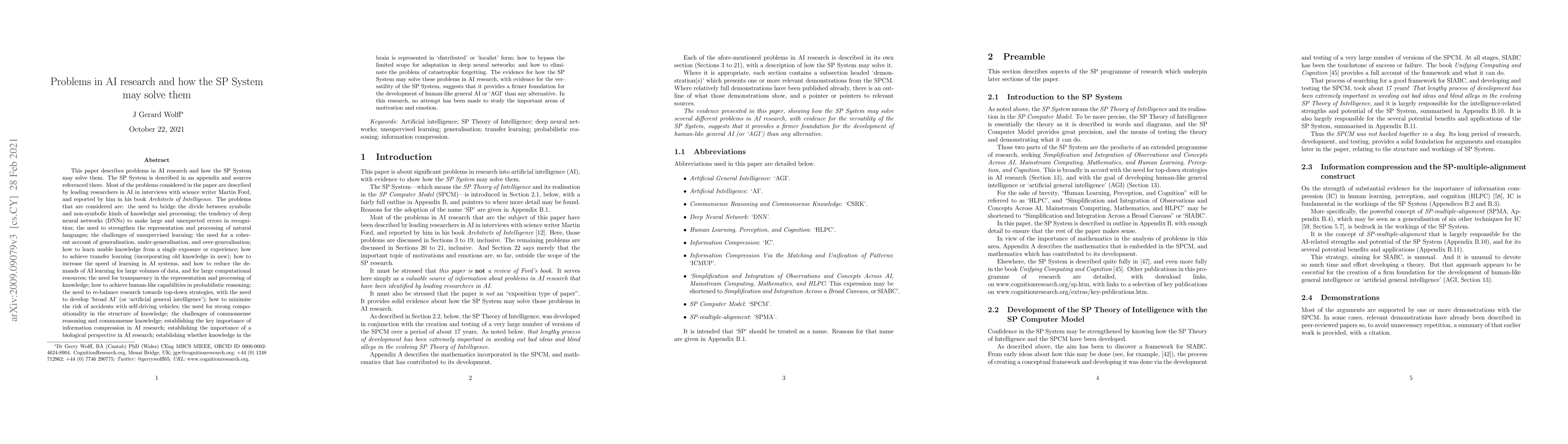 This paper identifies key challenges in AI research, including bridging symbolic and non-symbolic knowledge, improving neural network error rates, and enhancing natural language processing, among others. It proposes that the SP System could address these issues by offering a more integrated and efficient approach to AI development.