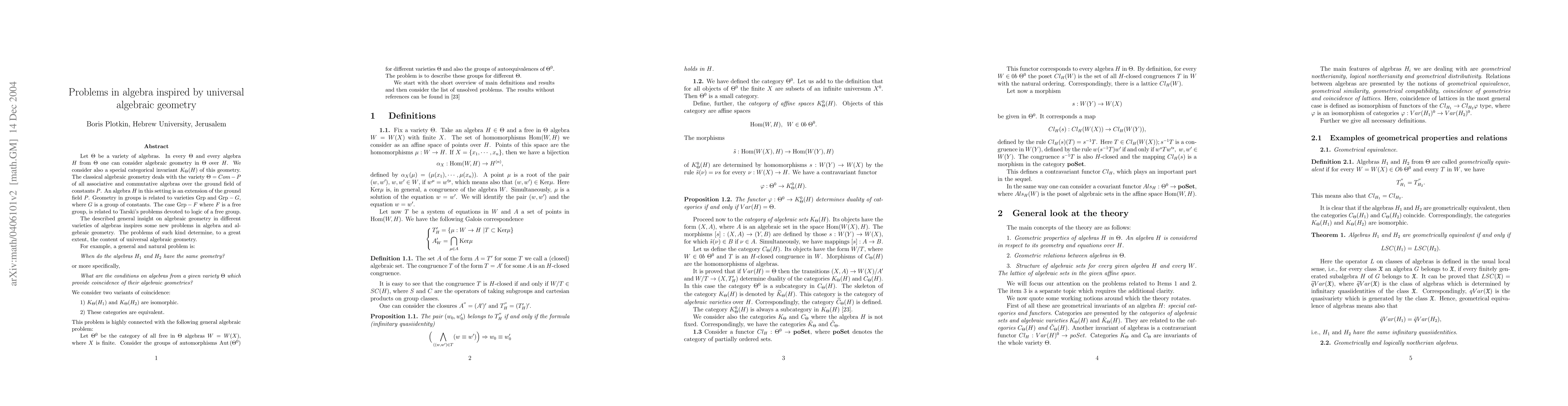 Let $\Theta$ be a variety of algebras. In every $\Theta$ and every algebra $H$ from $\Theta$ one can consider algebraic geometry in $\Theta$ over $H$. We consider also a special categorical invariant $K_\Theta (H)$ of this geometry. The classical algebraic geometry deals with the variety $\Theta=Com-P$ of all associative and commutative algebras over the ground field of constants $P$. An algebra $H$ in this setting is an extension of the ground field $P$. Geometry in groups is related to varieties $\Grp$ and $\Grp-G$, where $G$ is a group of constants. The case $\Grp -F$ where $F$ is a free group, is related to Tarski's problems devoted to logic of a free group. he described general insight on algebraic geometry in different varieties of algebras inspires some new problems in algebra and algebraic geometry. The problems of such kind determine, to a great extent, the content of universal algebraic geometry. We start with the short overview of main definitions and results and then consider the list of unsolved problems.