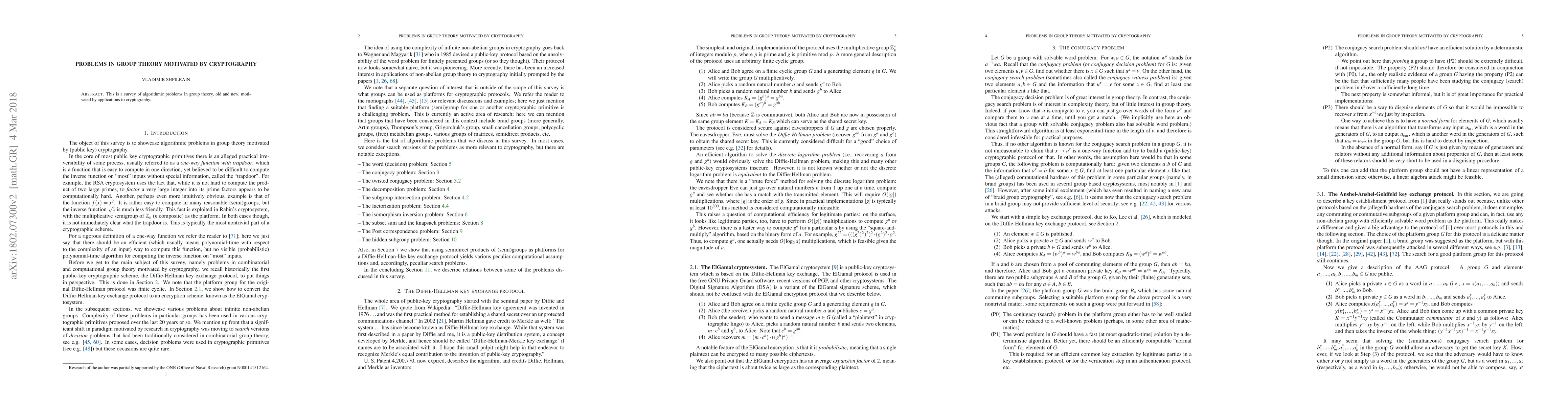 This paper surveys algorithmic problems in group theory motivated by applications to cryptography, focusing on key findings related to cryptographic challenges such as Diffie-Hellman key exchange and discrete logarithms.