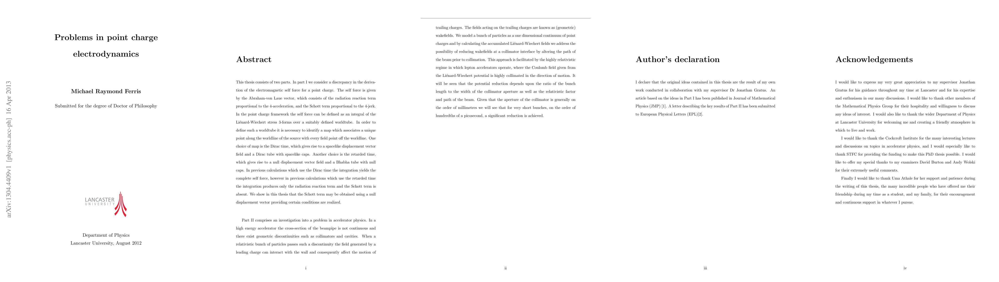(Shortened due to character limit) This thesis consists of two parts. In part I we consider a discrepancy in the derivation of the electromagnetic self force for a point charge. In the point charge framework the self force can be defined as an integral of the Lienard-Wiechert stress 3-forms over a suitably defined worldtube. We show the Schott term may be obtained using a null displacement vector to define the worldtube providing certain conditions are realized. Part II comprises an investigation into a problem in accelerator physics. In a high energy accelerator the cross-section of the beampipe is not continuous and there exist geometric discontinuities such as collimators and cavities. When a relativistic bunch of particles passes such a discontinuity the field generated by a leading charge can interact with the wall and consequently affect the motion of trailing charges. The fields acting on the trailing charges are known as (geometric) wakefields. We model a bunch of particles as a one dimensional continuum of point charges and by calculating the accumulated Lienard-Wiechert fields we address the possibility of reducing wakefields at a collimator interface by altering the path of the beam prior to collimation. This approach is facilitated by the highly relativistic regime in which lepton accelerators operate, where the Coulomb field given from the Lienard-Wiechert potential is highly collimated in the direction of motion. It will be seen that the potential reduction depends upon the ratio of the bunch length to the width of the collimator aperture as well as the relativistic factor and path of the beam. Given that the aperture of the collimator is generally on the order of millimetres we will see that for very short bunches, on the order of hundredths of a picosecond, a significant reduction is achieved.