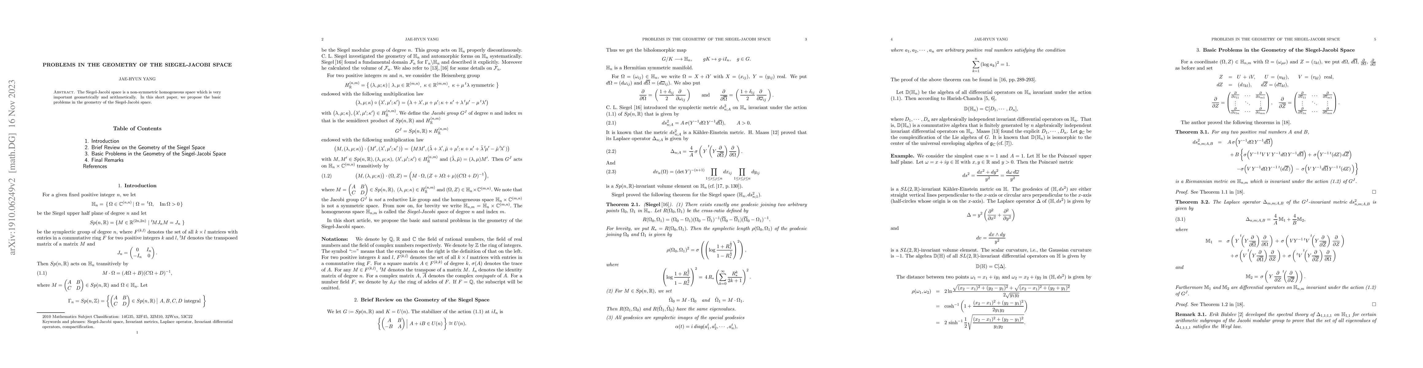 The Siegel-Jacobi space is a non-symmetric homogeneous space which is very important geometrically and arithmetically. In this short paper, we propose the basic problems in the geometry of the Siegel-Jacobi space.