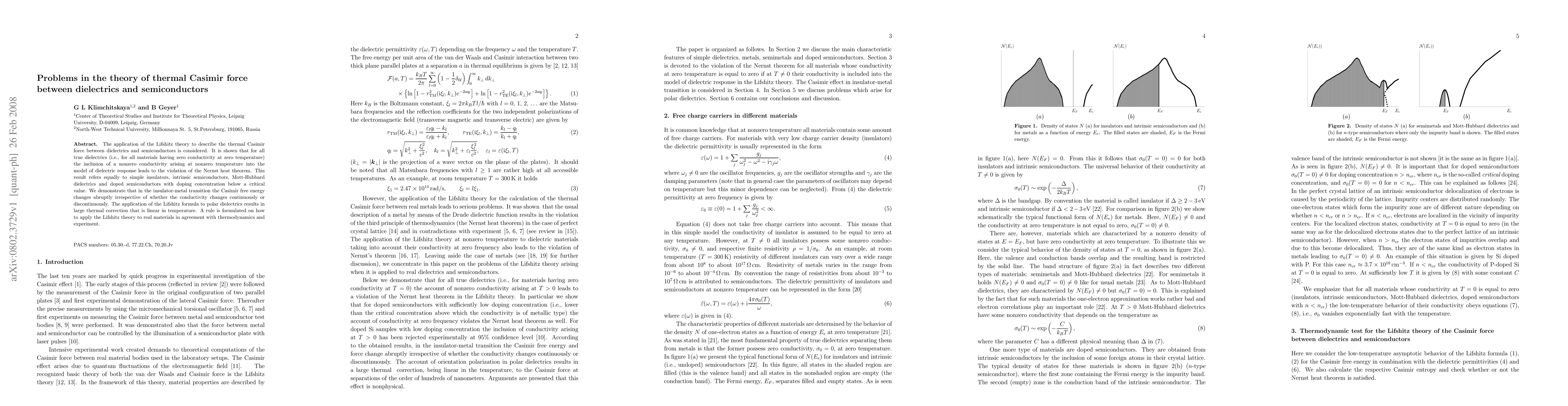This paper examines the application of Lifshitz theory to the thermal Casimir force between dielectrics and semiconductors, finding that nonzero conductivity at nonzero temperatures violates the Nernst heat theorem for true dielectrics. It also reveals abrupt changes in Casimir free energy at the insulator-metal transition and provides a rule for correctly applying Lifshitz theory to real materials.