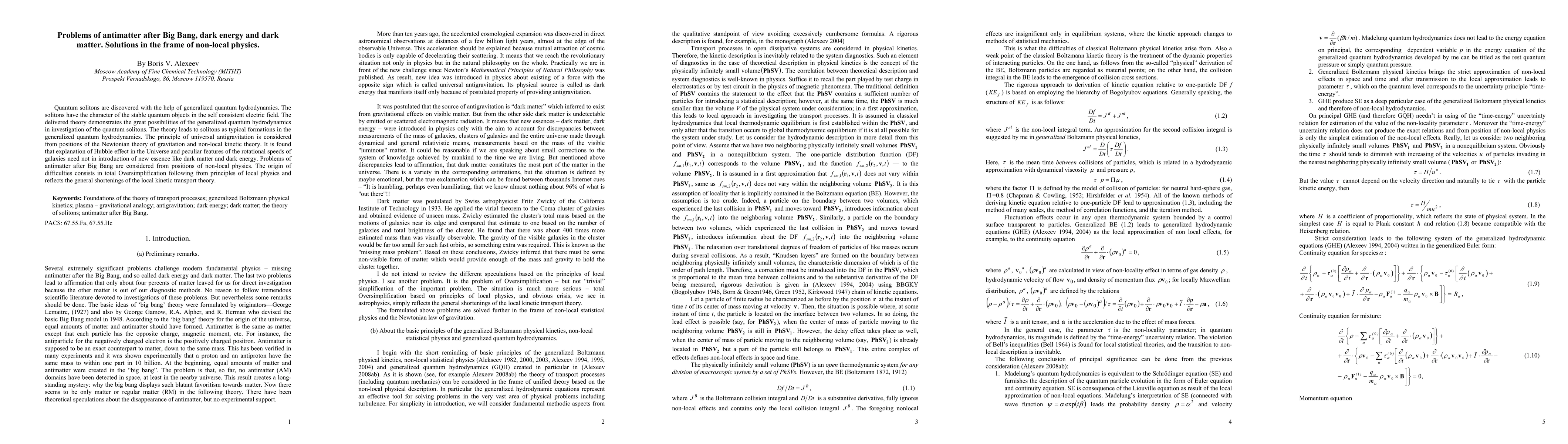 Quantum solitons are discovered with the help of generalized quantum hydrodynamics. The solitons have the character of the stable quantum objects in the self consistent electric field. The delivered theory demonstrates the great possibilities of the generalized quantum hydrodynamics in investigation of the quantum solitons. The theory leads to solitons as typical formations in the generalized quantum hydrodynamics. The principle of universal antigravitation is considered from positions of the Newtonian theory of gravitation and non-local kinetic theory. It is found that explanation of Hubble effect in the Universe and peculiar features of the rotational speeds of galaxies need not in introduction of new essence like dark matter and dark energy. Problems of antimatter after Big Bang are considered from positions of non-local physics. The origin of difficulties consists in total Oversimplification following from principles of local physics and reflects the general shortenings of the local kinetic transport theory. Keywords: Foundations of the theory of transport processes; generalized Boltzmann physical kinetics; plasma - gravitational analogy; antigravitation; dark energy; dark matter; the theory of solitons; antimatter after Big Bang. PACS: 67.55.Fa, 67.55.Hc