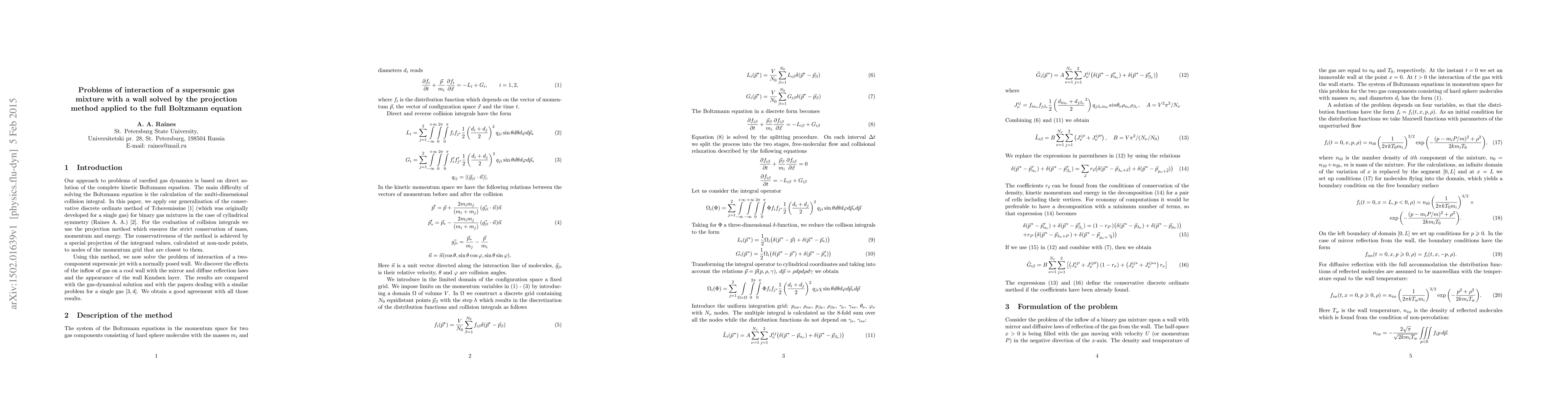 The paper presents a numerical solution for non-steady supersonic gas mixture inflow on a wall, using the full Boltzmann equation and the projection method. The method, adapted for binary gas mixtures, shows good agreement with existing one-component gas results.