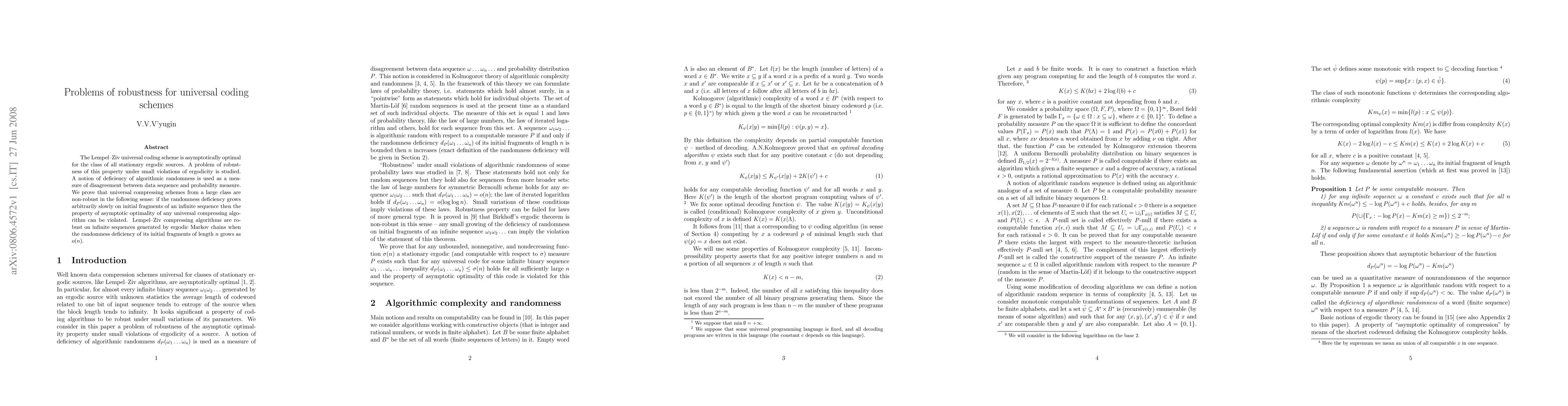 The Lempel-Ziv universal coding scheme is asymptotically optimal for the class of all stationary ergodic sources. A problem of robustness of this property under small violations of ergodicity is studied. A notion of deficiency of algorithmic randomness is used as a measure of disagreement between data sequence and probability measure. We prove that universal compressing schemes from a large class are non-robust in the following sense: if the randomness deficiency grows arbitrarily slowly on initial fragments of an infinite sequence then the property of asymptotic optimality of any universal compressing algorithm can be violated. Lempel-Ziv compressing algorithms are robust on infinite sequences generated by ergodic Markov chains when the randomness deficiency of its initial fragments of length $n$ grows as $o(n)$.