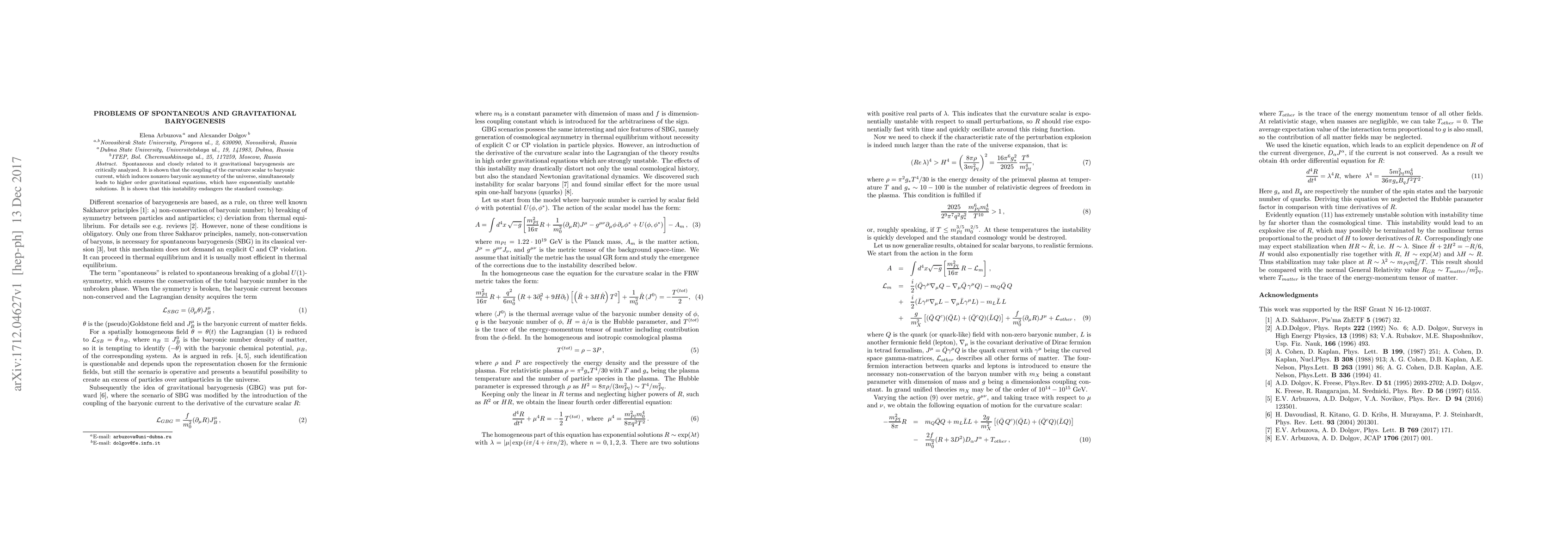 This paper critically analyzes spontaneous and gravitational baryogenesis, revealing that coupling the curvature scalar to the baryonic current induces a nonzero baryonic asymmetry but also leads to higher-order gravitational equations with exponentially unstable solutions, posing a threat to standard cosmology.