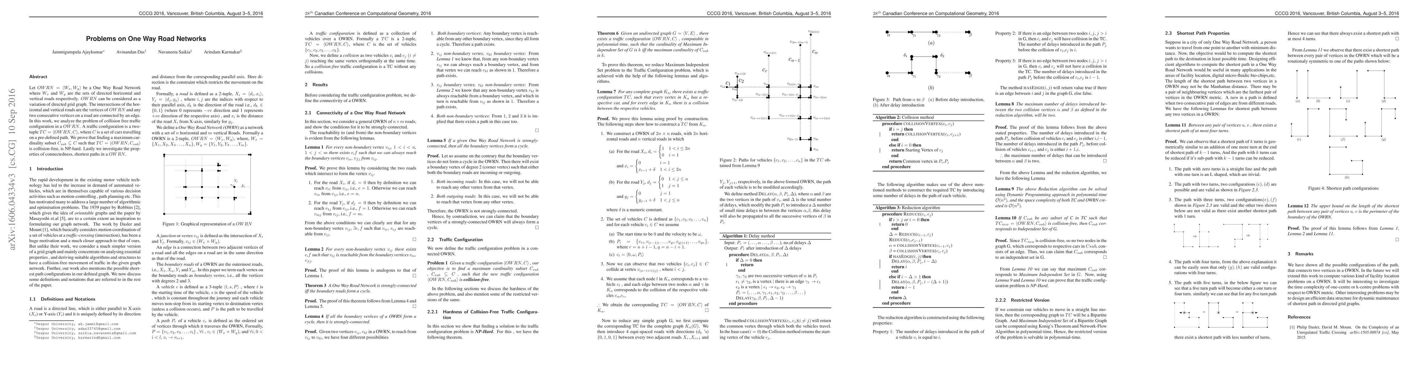This paper explores the complexity of collision-free traffic configurations in One Way Road Networks (OWRN), proving the problem of finding a maximum subset of cars without collisions is NP-hard. It also investigates connectedness and shortest paths within OWRN.