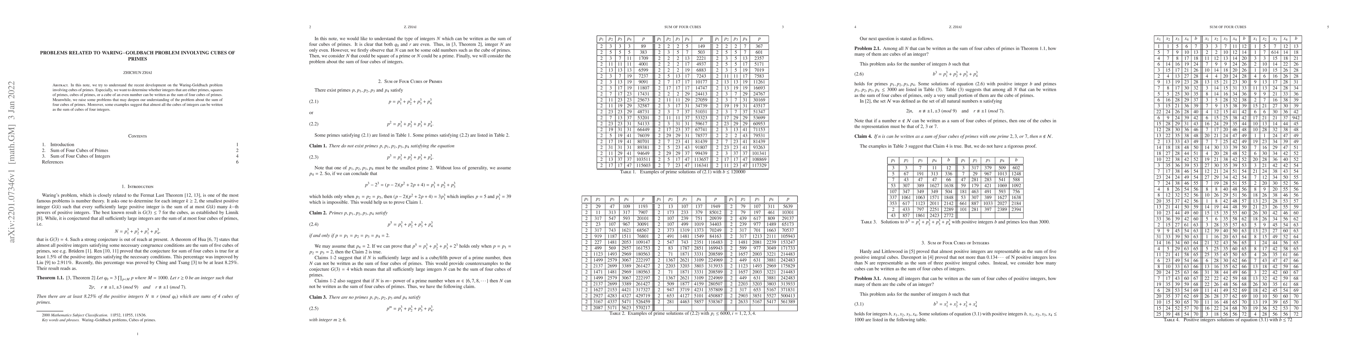 This paper investigates recent advancements in the Waring-Goldbach problem focusing on cubes of primes, exploring if integers composed of primes, squares, and cubes of primes can be expressed as the sum of four cubes of primes. It also poses further questions to enhance comprehension and provides examples indicating that most cubes of integers can be represented as sums of four integer cubes.