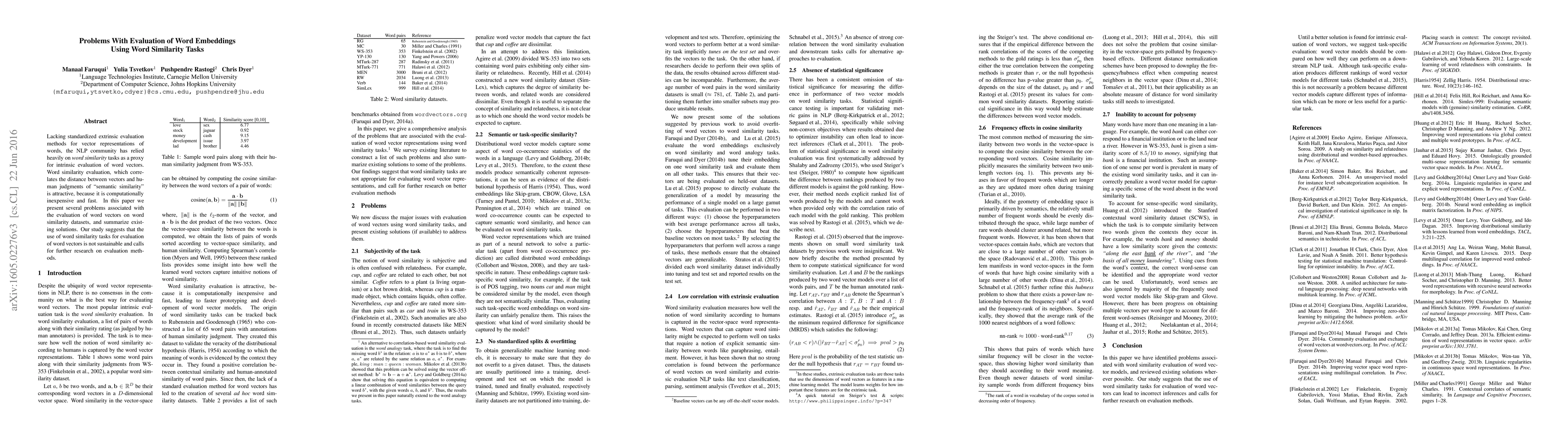 This paper identifies significant issues with using word similarity tasks for evaluating word embeddings and argues that these tasks are not a reliable measure for intrinsic evaluation, urging the NLP community to develop more robust evaluation methods.