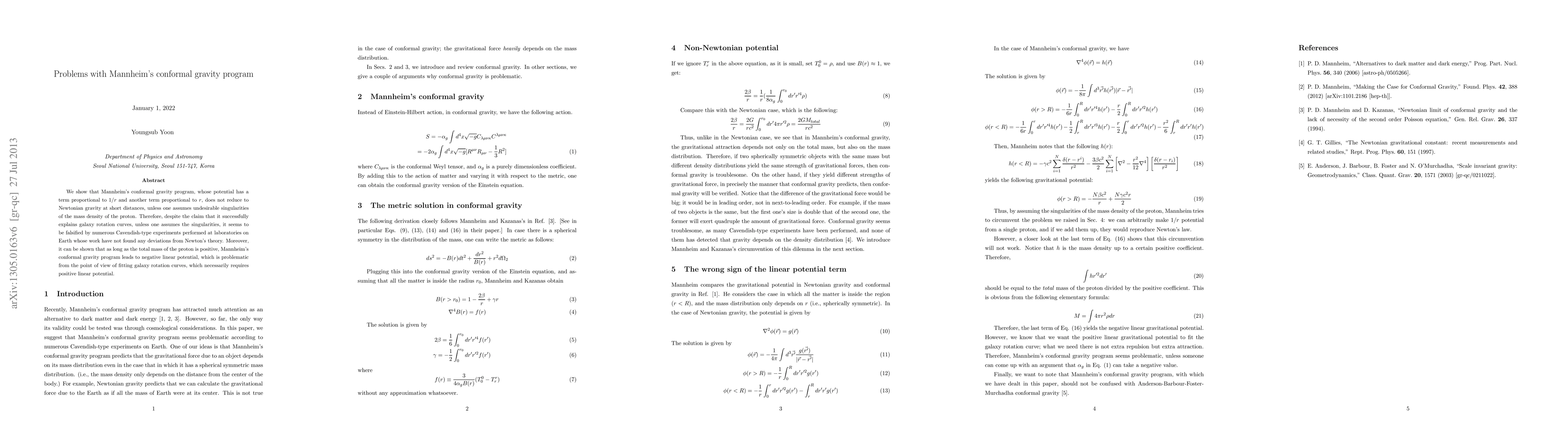 The paper provides a detailed mathematical analysis of Mannheim's conformal gravity program, identifying its inability to reduce to Newtonian gravity without singularities and its inconsistency with positive linear potential requirement for galaxy rotation curves.