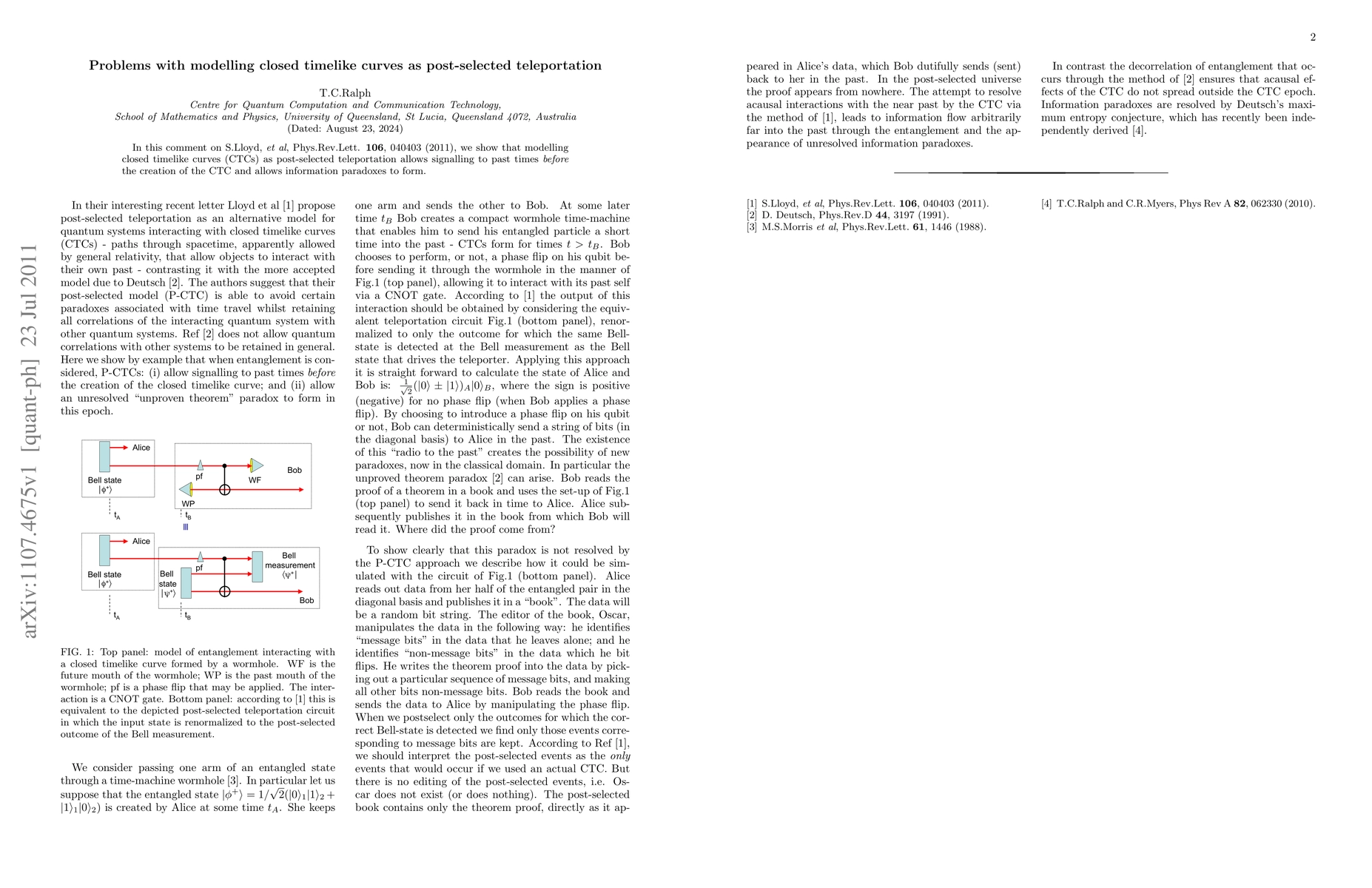 In this comment on S.Lloyd, et al, Phys.Rev.Lett. 106, 040403 (2011), we show that modelling closed timelike curves (CTCs) as post-selected teleportation allows signalling to past times before the creation of the CTC and allows information paradoxes to form.