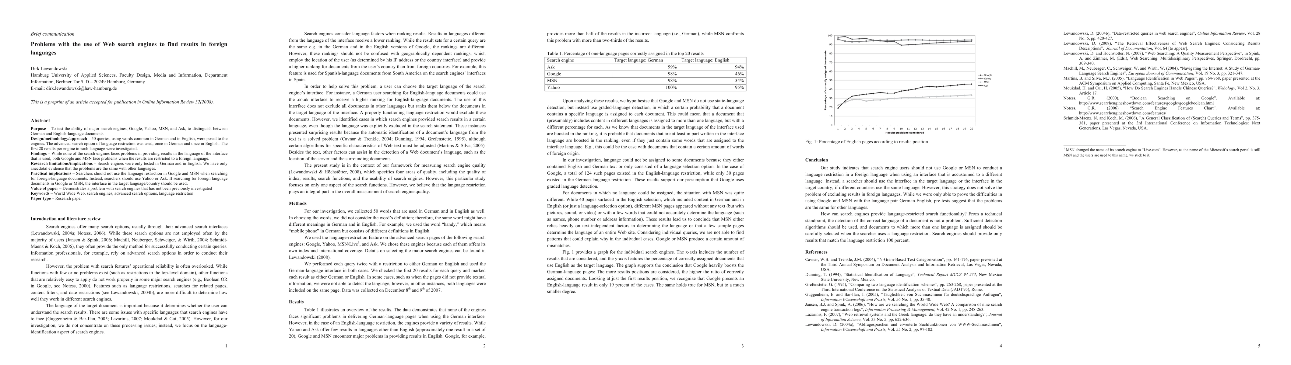 Purpose - To test the ability of major search engines, Google, Yahoo, MSN, and Ask, to distinguish between German and English-language documents Design/methodology/approach - 50 queries, using words common in German and in English, were posed to the engines. The advanced search option of language restriction was used, once in German and once in English. The first 20 results per engine in each language were investigated. Findings - While none of the search engines faces problems in providing results in the language of the interface that is used, both Google and MSN face problems when the results are restricted to a foreign language. Research limitations/implications - Search engines were only tested in German and in English. We have only anecdotal evidence that the problems are the same with other languages. Practical implications - Searchers should not use the language restriction in Google and MSN when searching for foreign-language documents. Instead, searchers should use Yahoo or Ask. If searching for foreign language documents in Google or MSN, the interface in the target language/country should be used. Value of paper - Demonstrates a problem with search engines that has not been previously investigated.