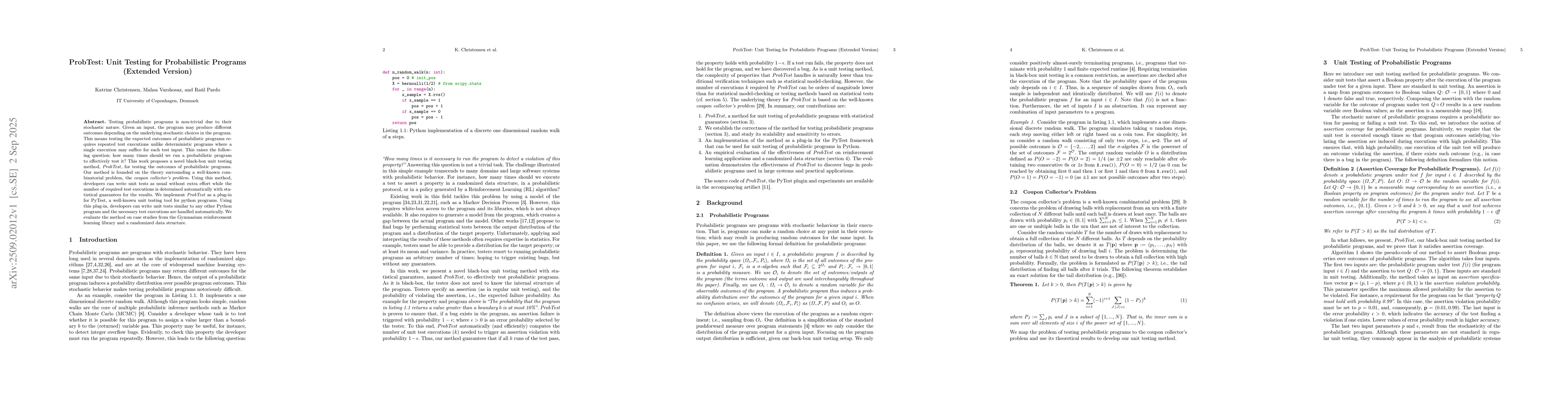 Testing probabilistic programs is non-trivial due to their stochastic nature. Given an input, the program may produce different outcomes depending on the underlying stochastic choices in the program. This means testing the expected outcomes of probabilistic programs requires repeated test executions unlike deterministic programs where a single execution may suffice for each test input. This raises the following question: how many times should we run a probabilistic program to effectively test it? This work proposes a novel black-box unit testing method, ProbTest, for testing the outcomes of probabilistic programs. Our method is founded on the theory surrounding a well-known combinatorial problem, the coupon collector's problem. Using this method, developers can write unit tests as usual without extra effort while the number of required test executions is determined automatically with statistical guarantees for the results. We implement ProbTest as a plug-in for PyTest, a well-known unit testing tool for python programs. Using this plug-in, developers can write unit tests similar to any other Python program and the necessary test executions are handled automatically. We evaluate the method on case studies from the Gymnasium reinforcement learning library and a randomized data structure.